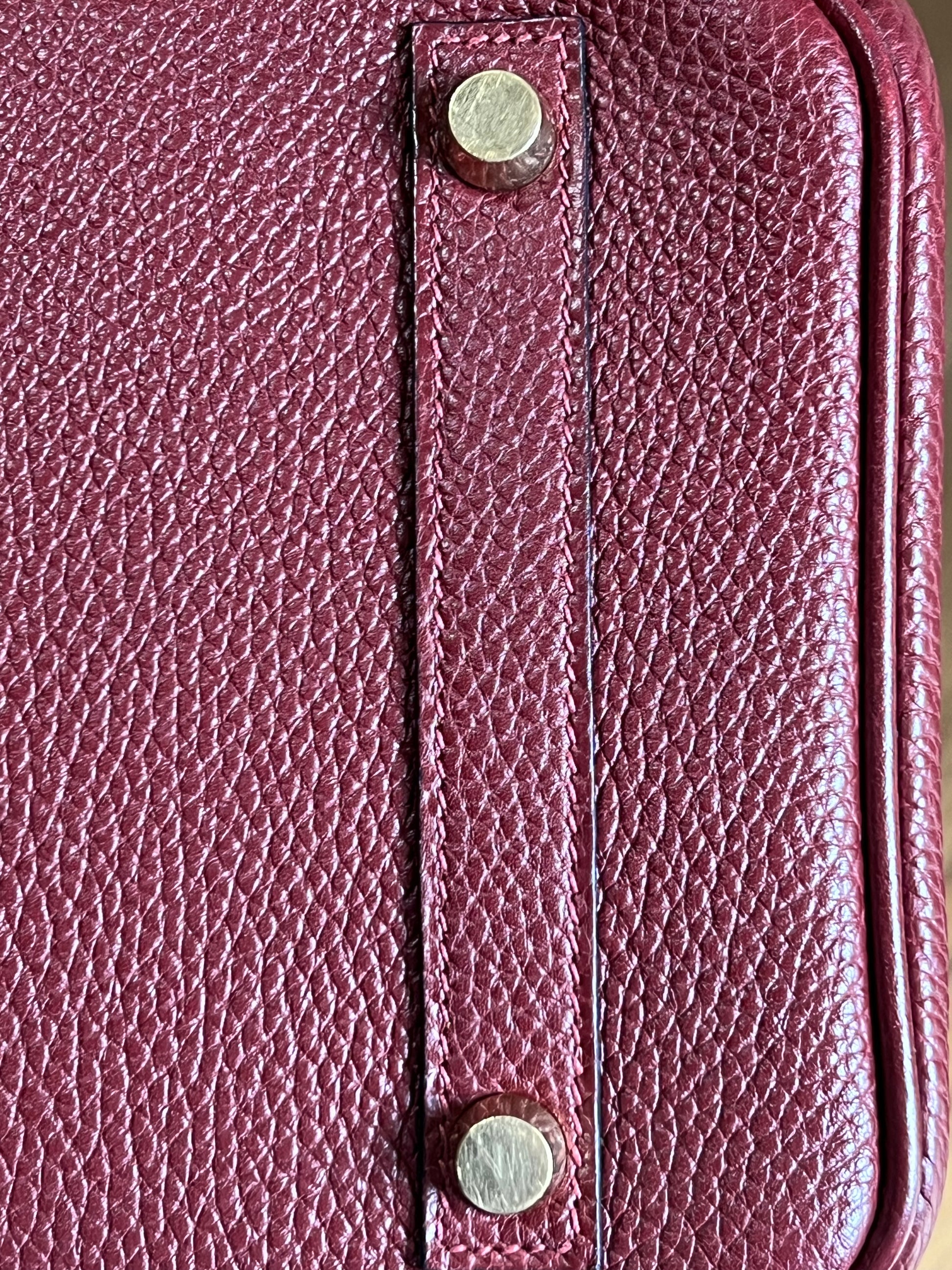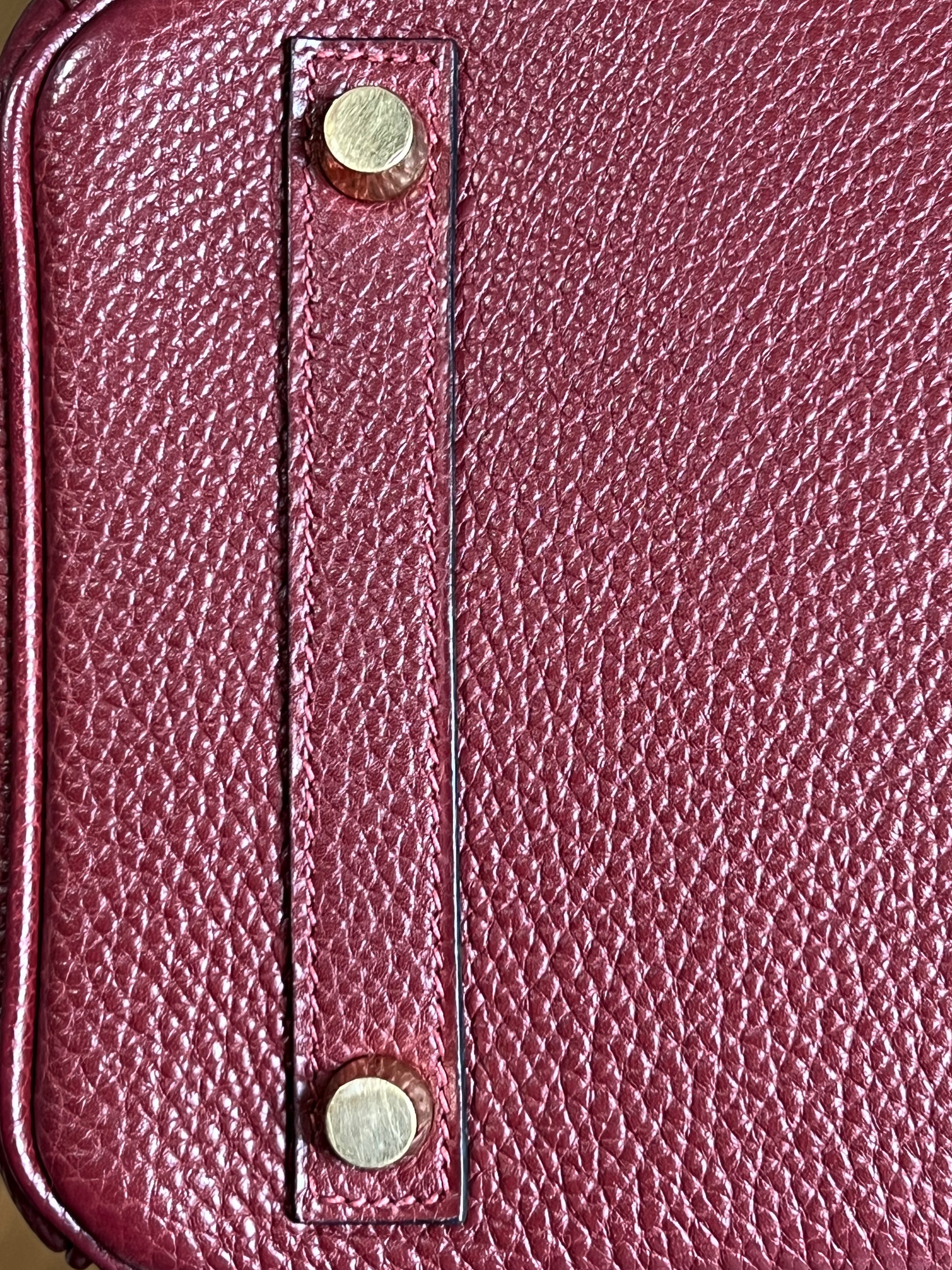 This item is in pre-owned vintage condition. The wear includes a small scuffs to the leather and slight rubbing to the corners. The interior base has minor markings and indentations. There is light scratching to the hardware and base studs and slight structure loss from normal use.