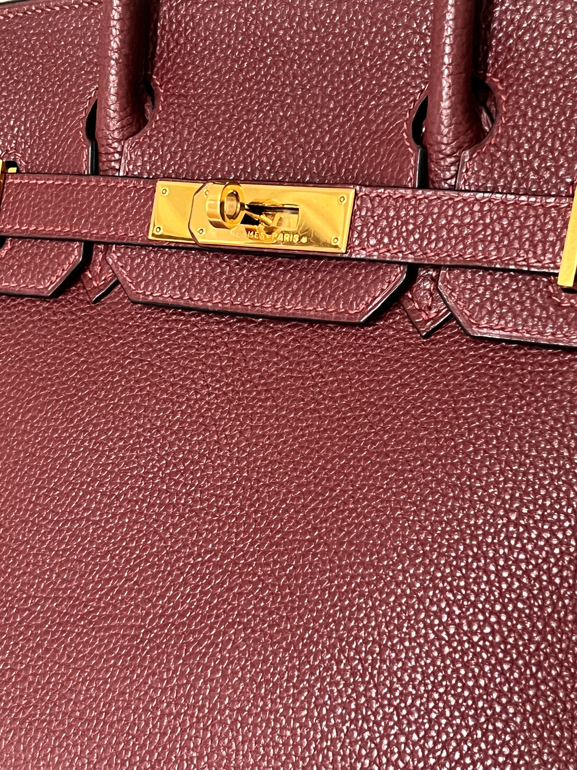 This is a vintage Hermes Birkin 30 bag. It is made from rouge H togo leather and lined in tonal leather with gold hardware and features a Kelly lock, padlock, keys, and clochette. Production stamp H (in a square), year 2004.