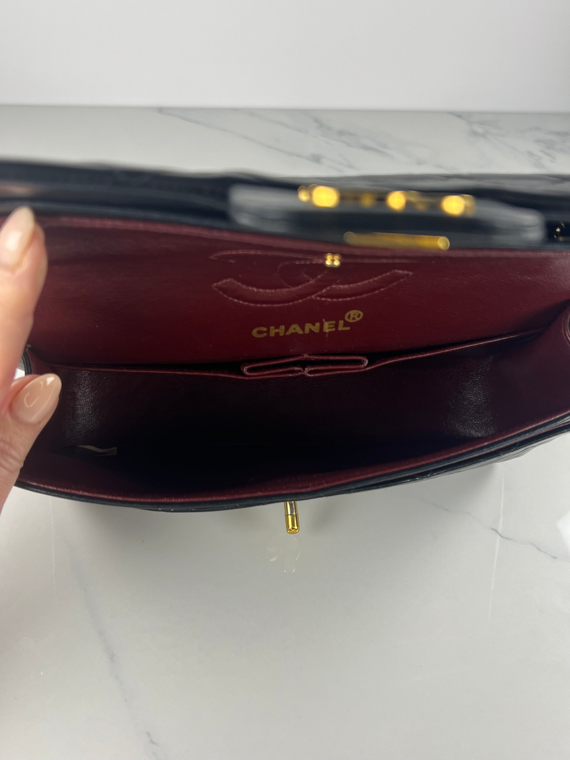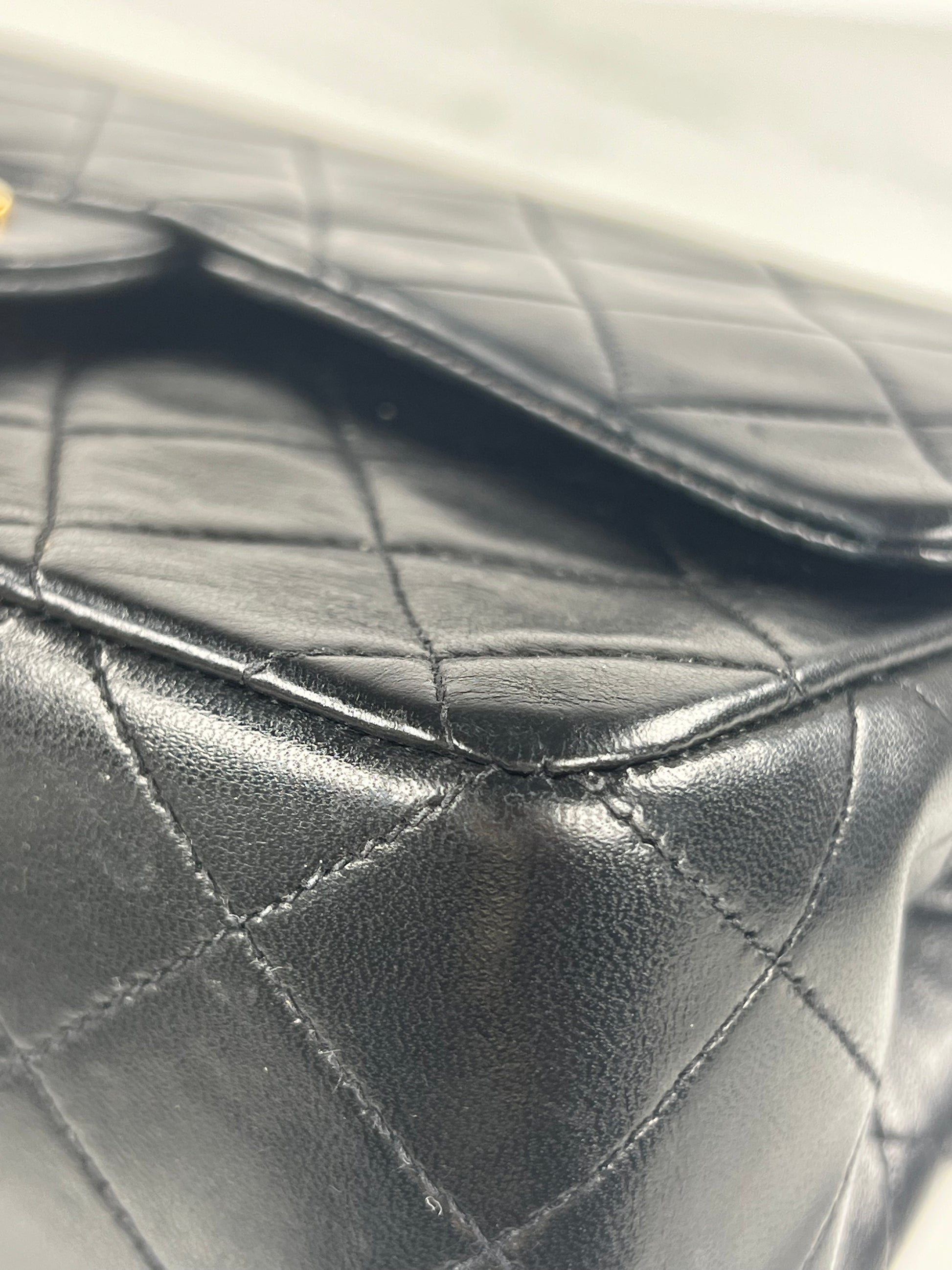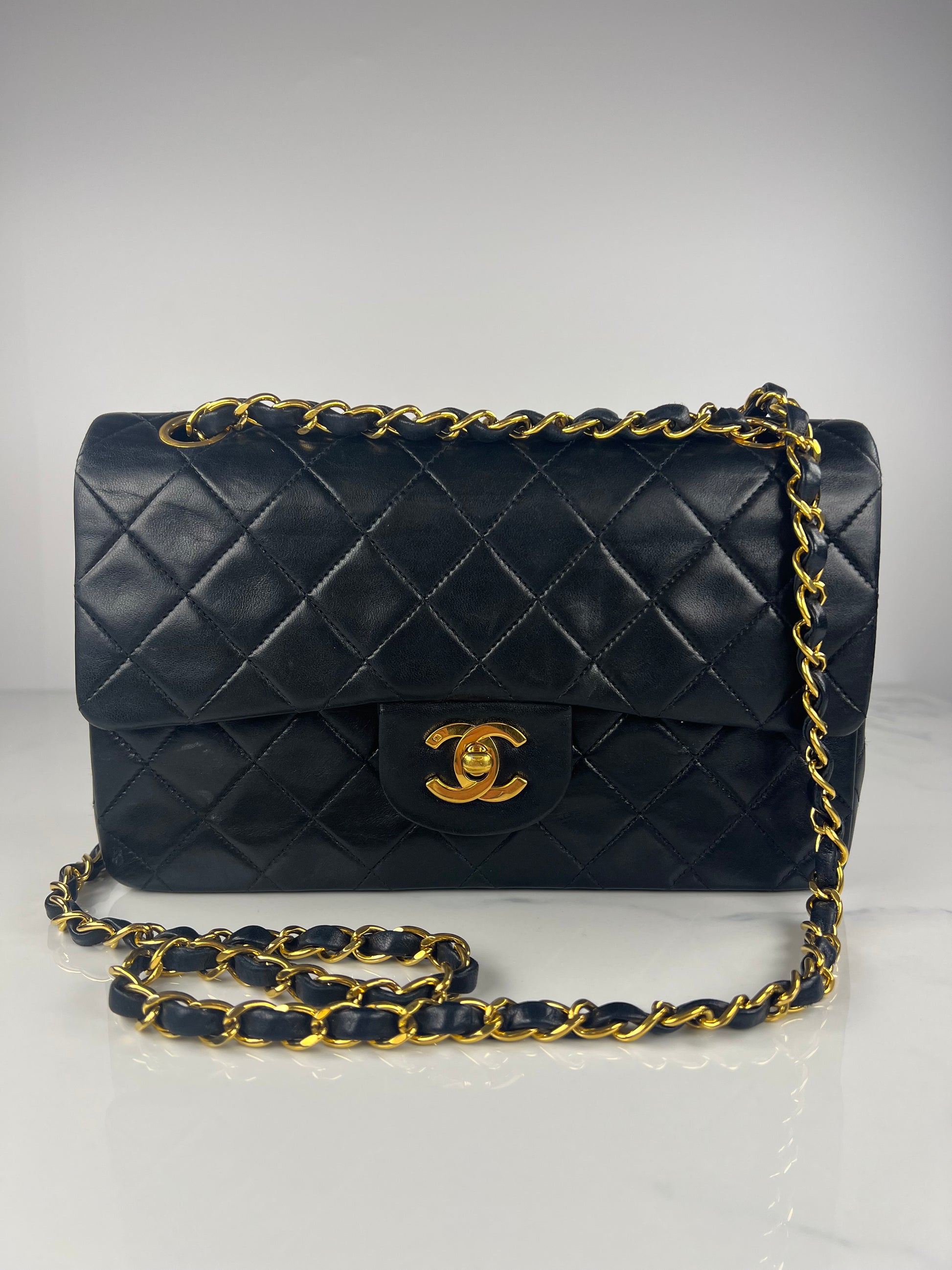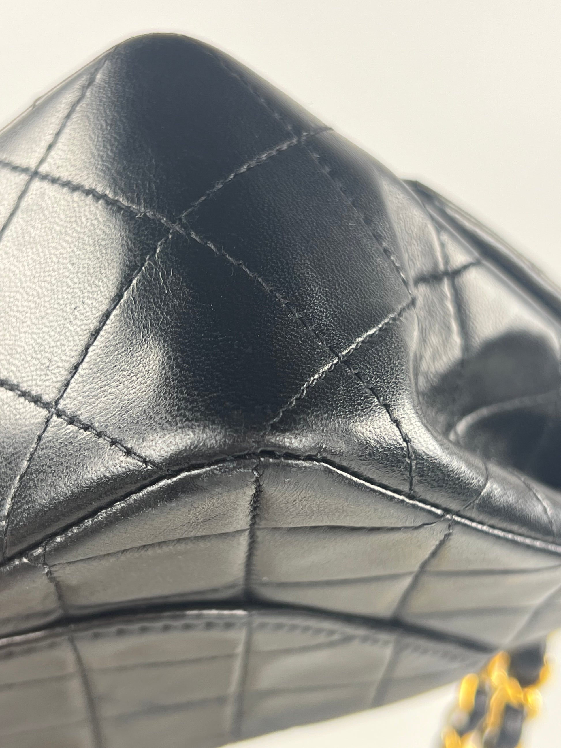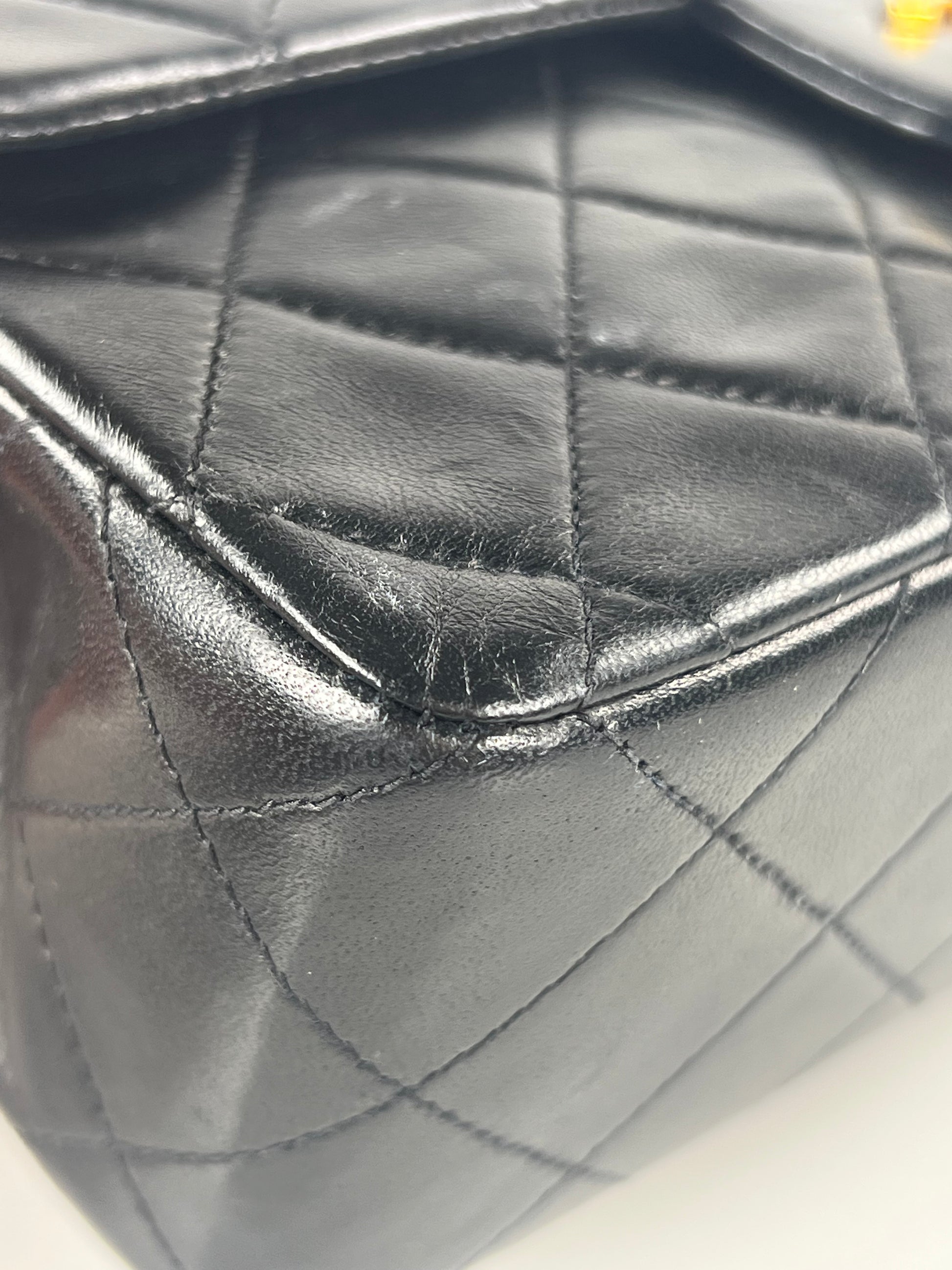 This is a Chanel Vintage Small Classic Double Flap in black diamond quilted lambskin leather. It is lined in burgundy-leather with 24k gold-tone hardware and features a double flap with signature CC turnlock. The wear includes slight dimpling to front, gentle scuffs to leather interwoven with chain, gentle scuffs to flap edges, light scuffs to base, corner scuffs and light scratches to clasp. It comes with the original box, authenticity card, and dust bag.