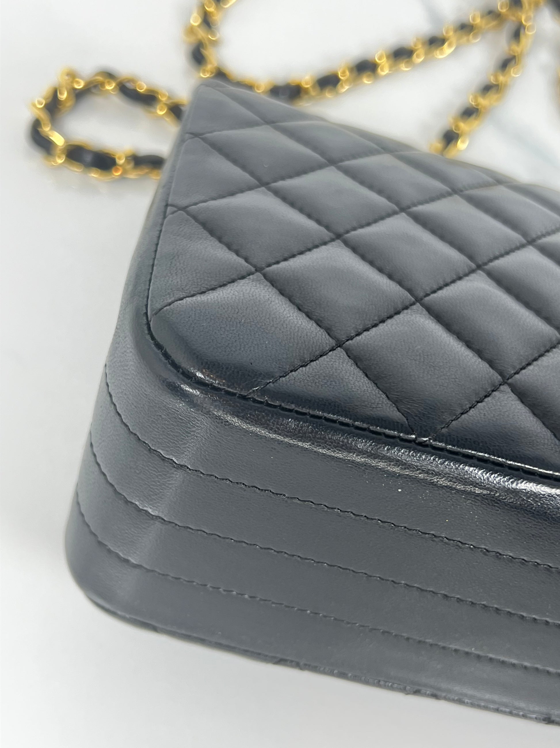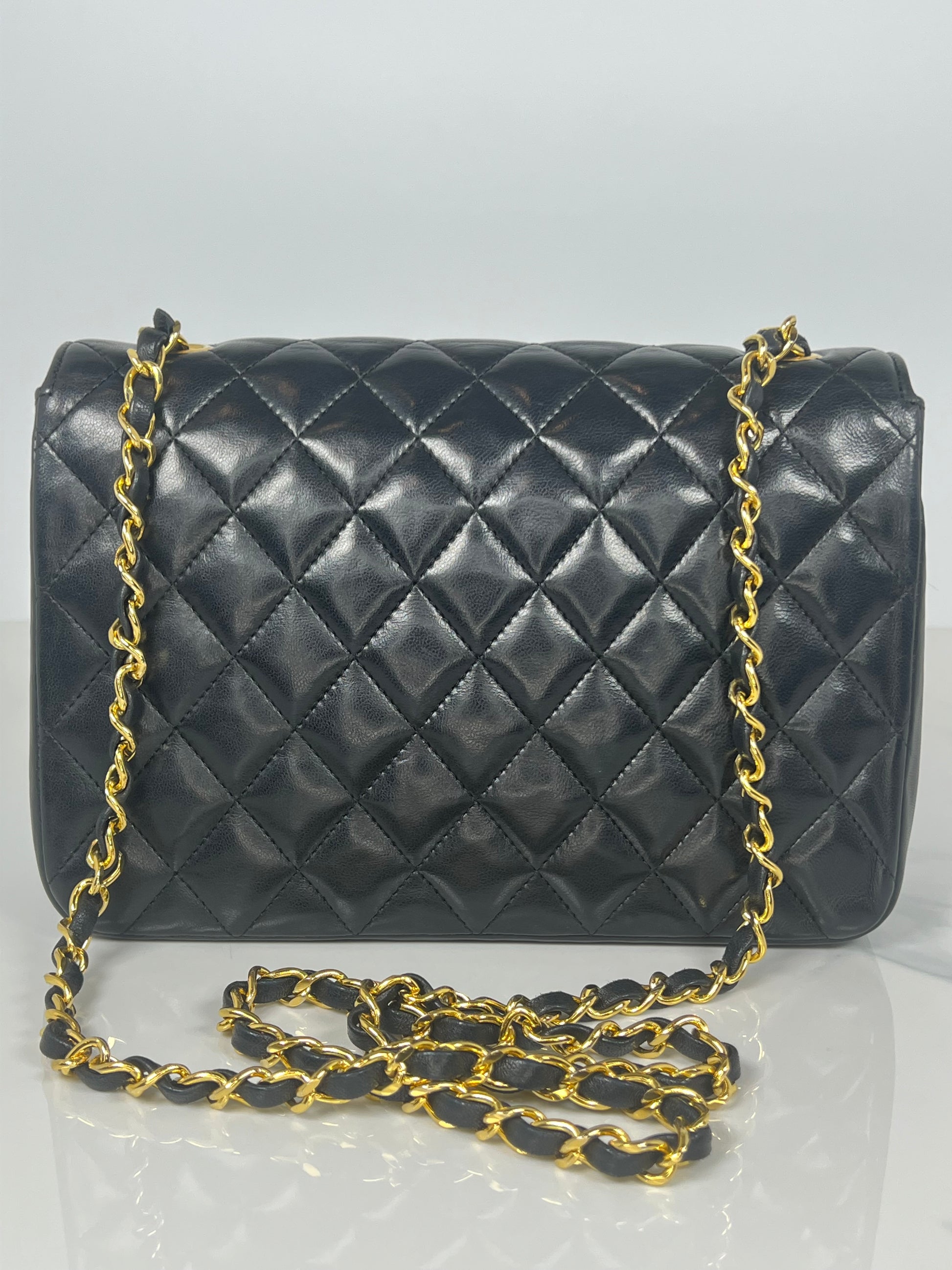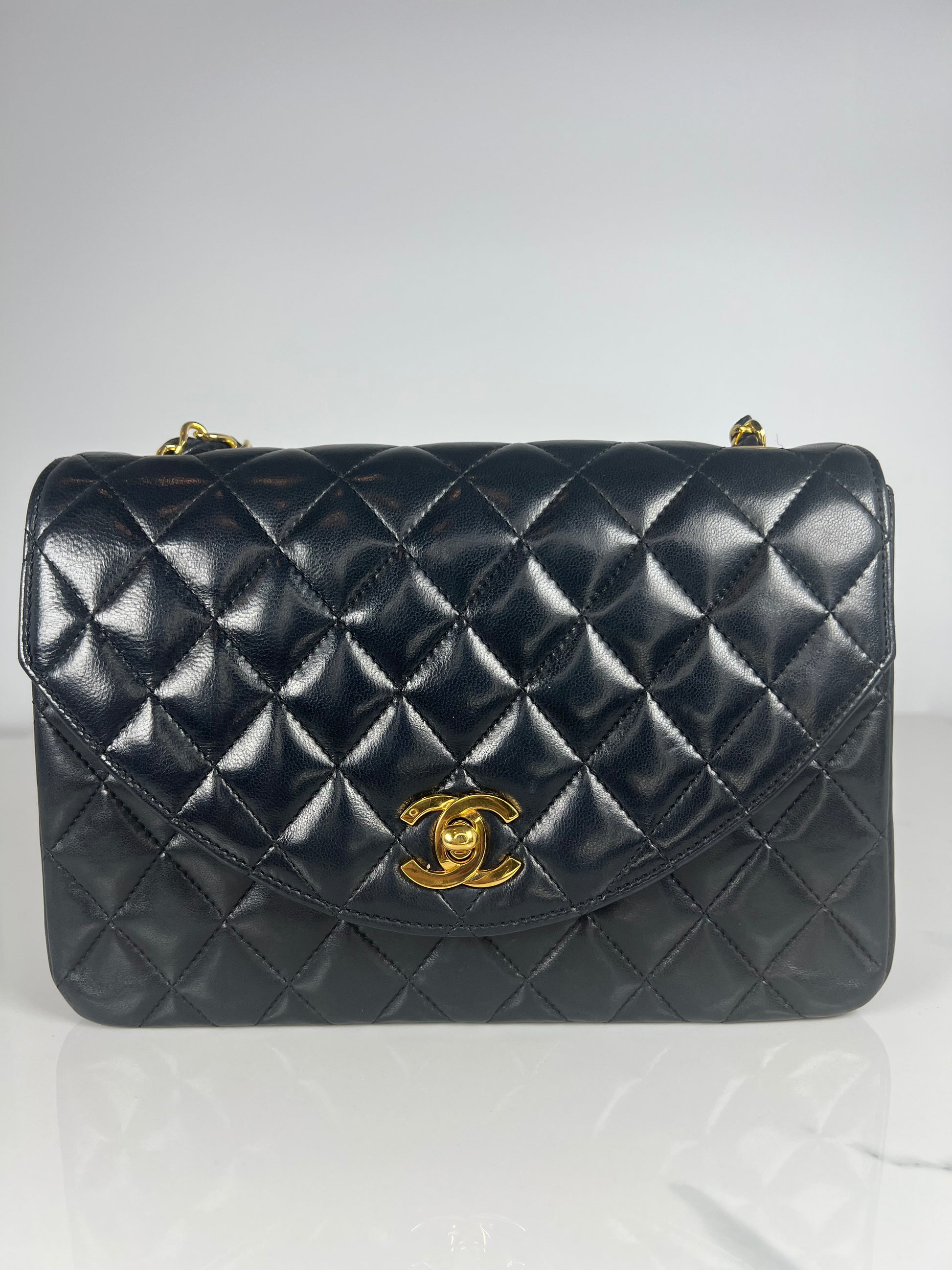 This is a vintage Chanel half moon flap in black diamond quilted lambskin leather. It is lined in burgundy leather with 24-karat gold plated hardware. Wear includes slight scratches on hardware and minor creasing throughout.