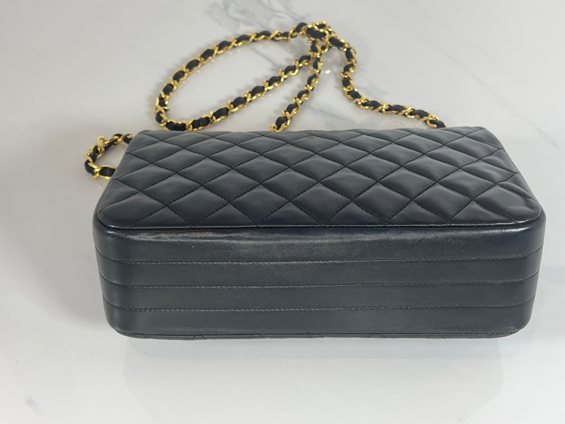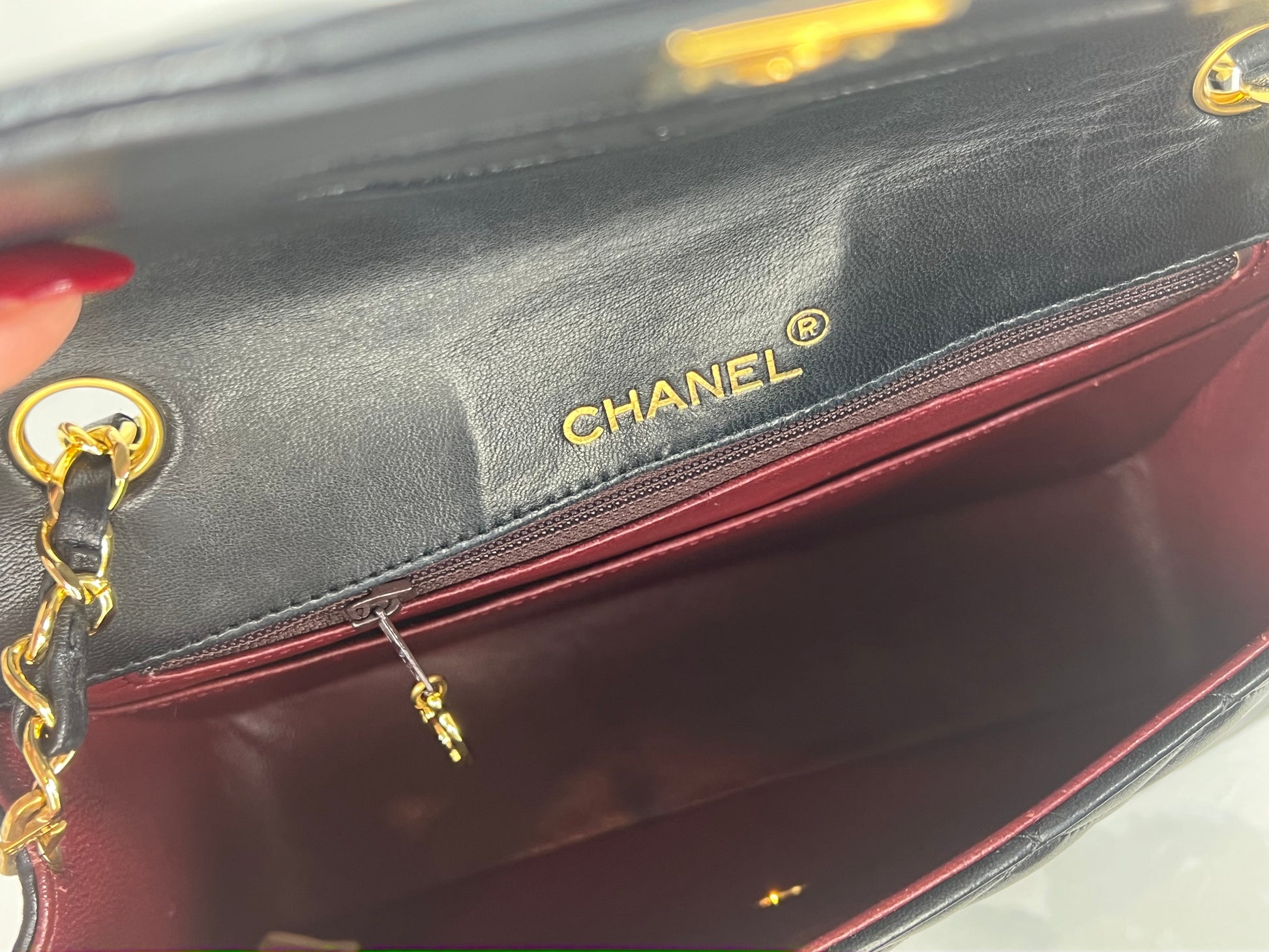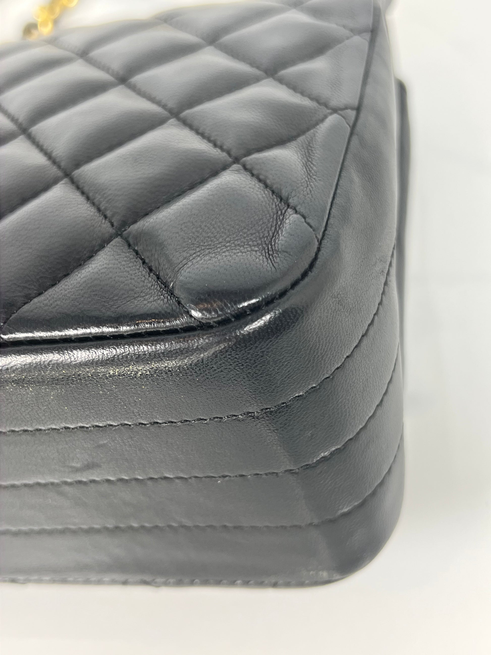 This is a vintage Chanel half moon flap in black diamond quilted lambskin leather. It is lined in burgundy leather with 24-karat gold plated hardware. Wear includes slight scratches on hardware and minor creasing throughout.