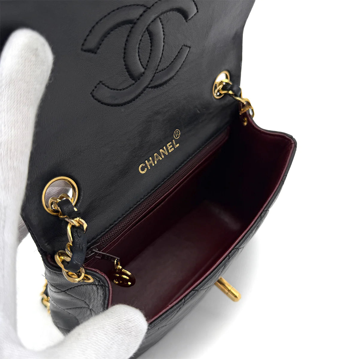This is a Chanel Vintage Square Mini Flap crafted in black diamond-quilted lambskin leather with 24k gold plated hardware. It features the signature CC turn-lock closure, interwoven leather-and-chain strap, back slip pocket, and burgundy leather interior.
