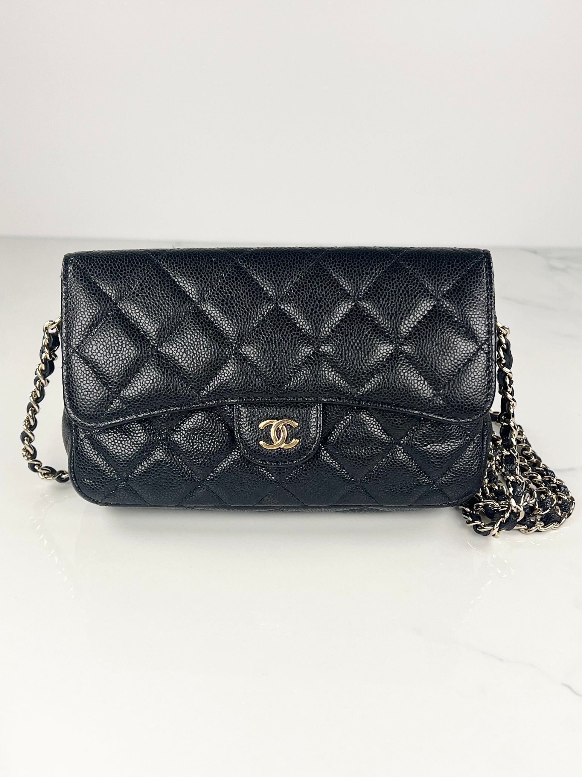 Black Caviar Flap Phone Holder on Chain