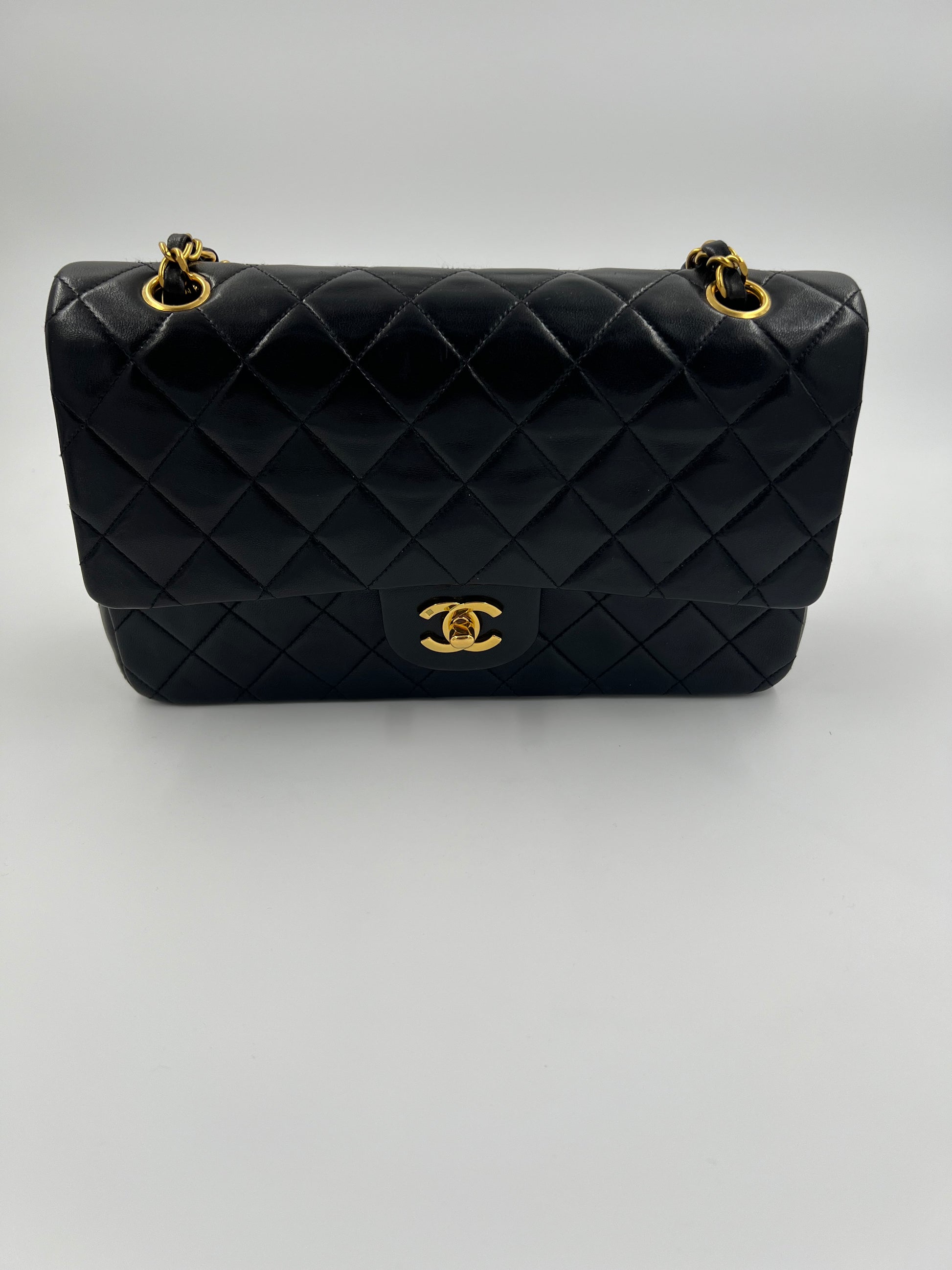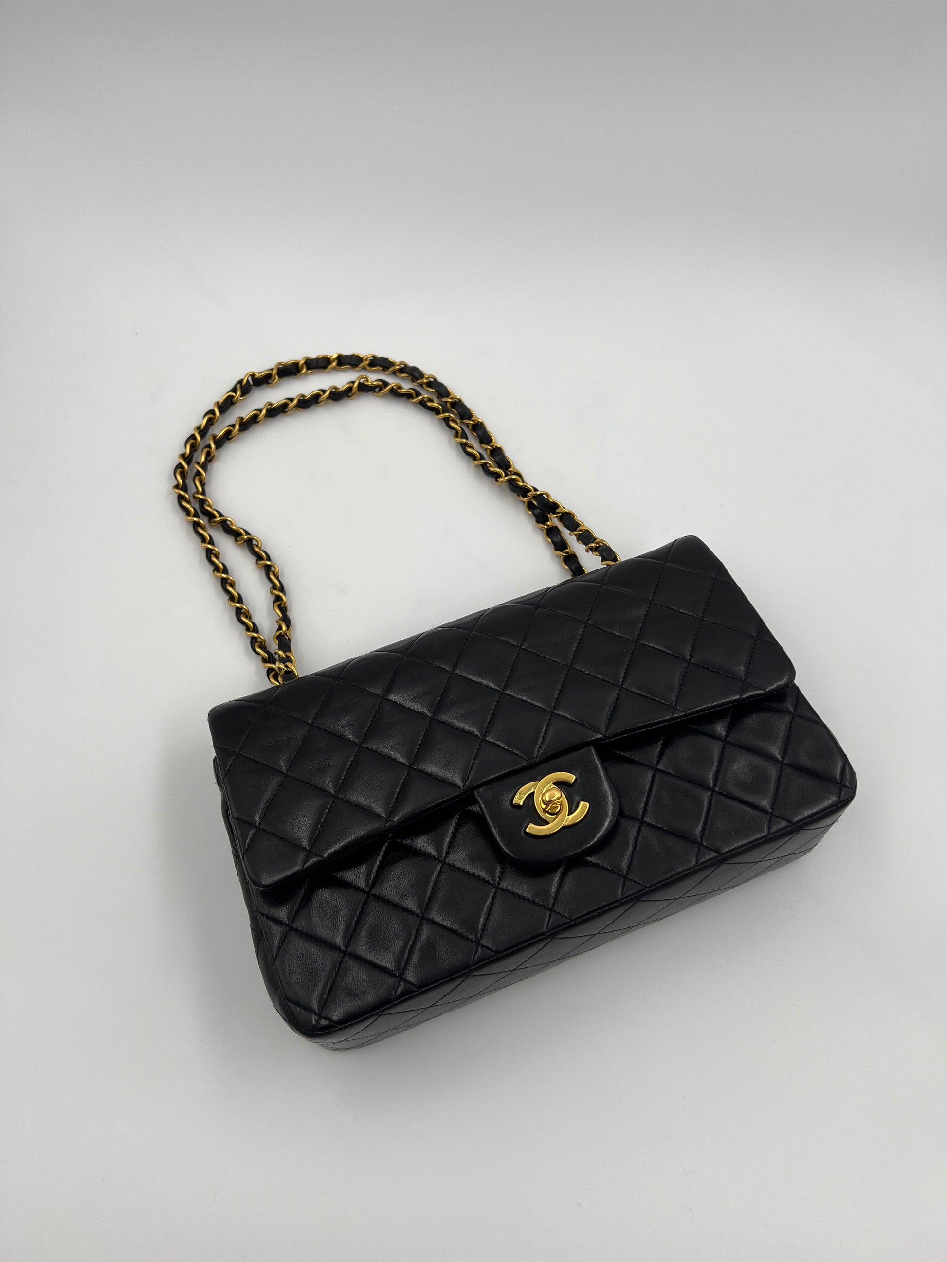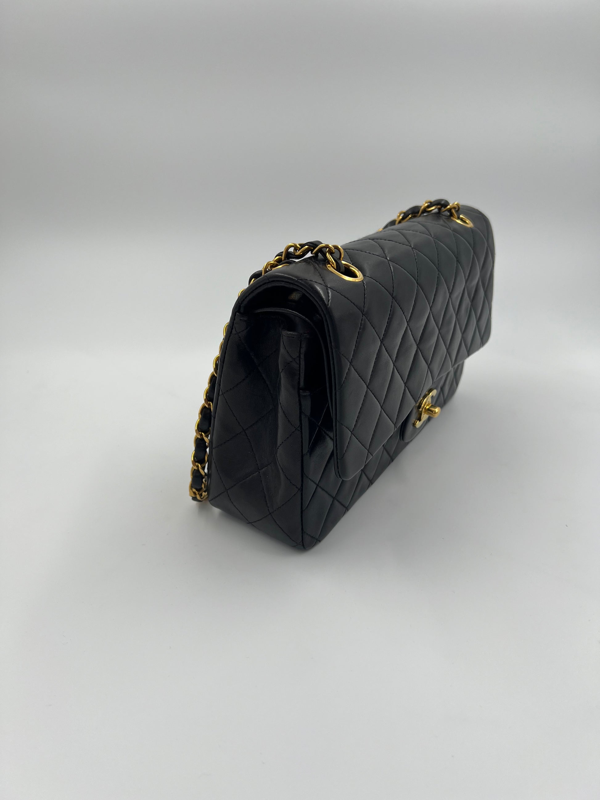 This is a vintage Chanel black medium classic double flap in quilted lambskin leather with 24k gold plated hardware. There are normal signs of wear including subtle structure loss, minor scratches on hardware and natural creasing. There is slight rubbing on the corners. The bag comes with original authentication card and Entrupy authentication (email for certificate).