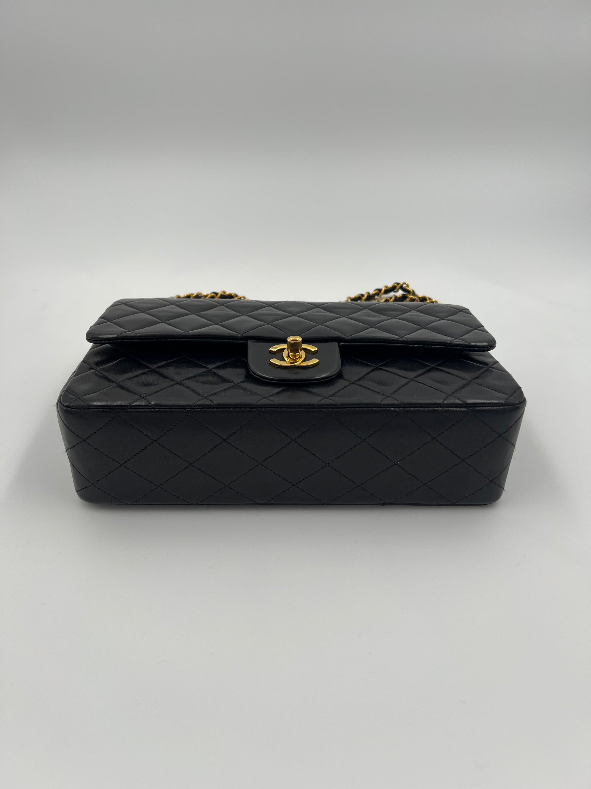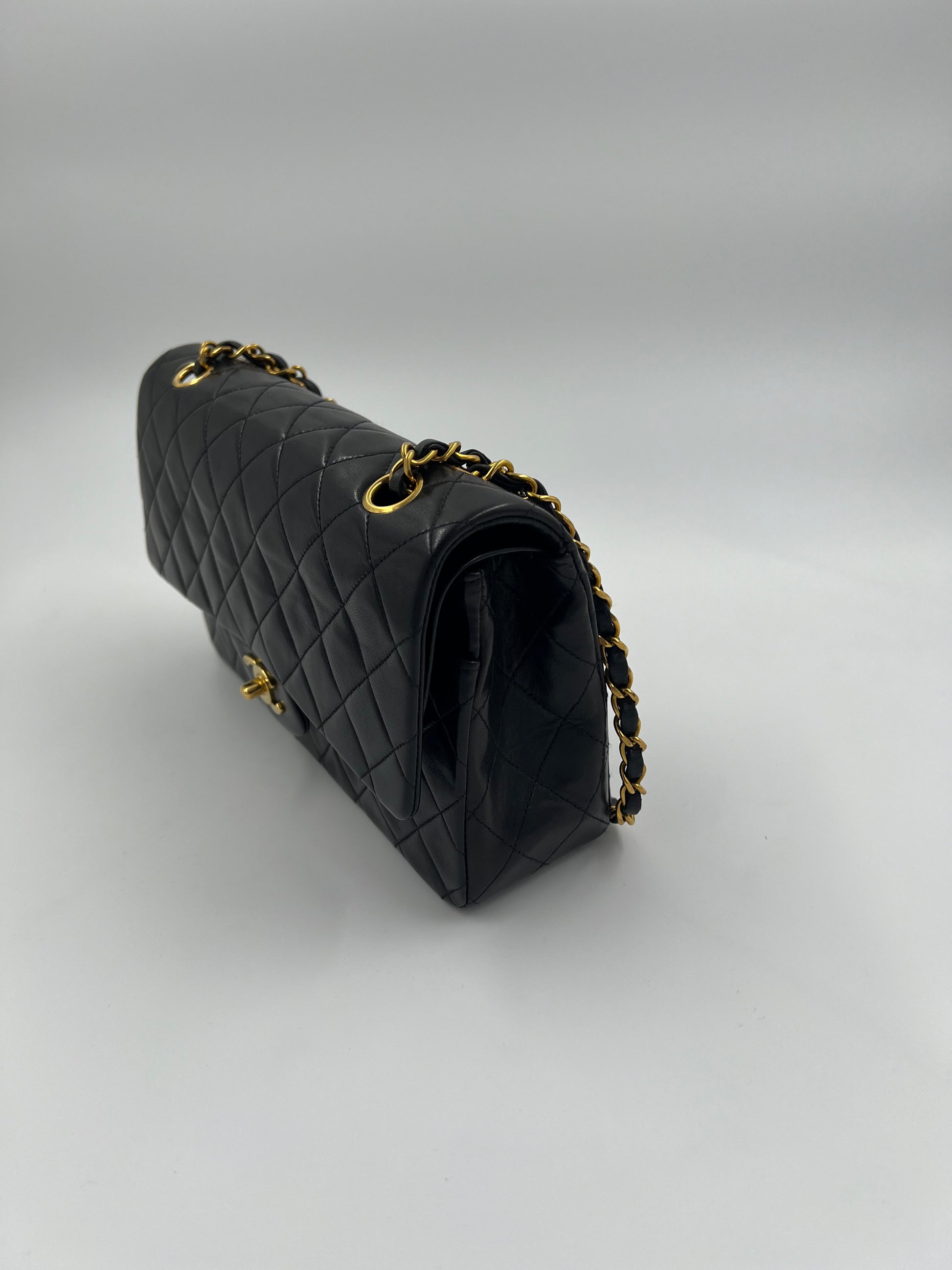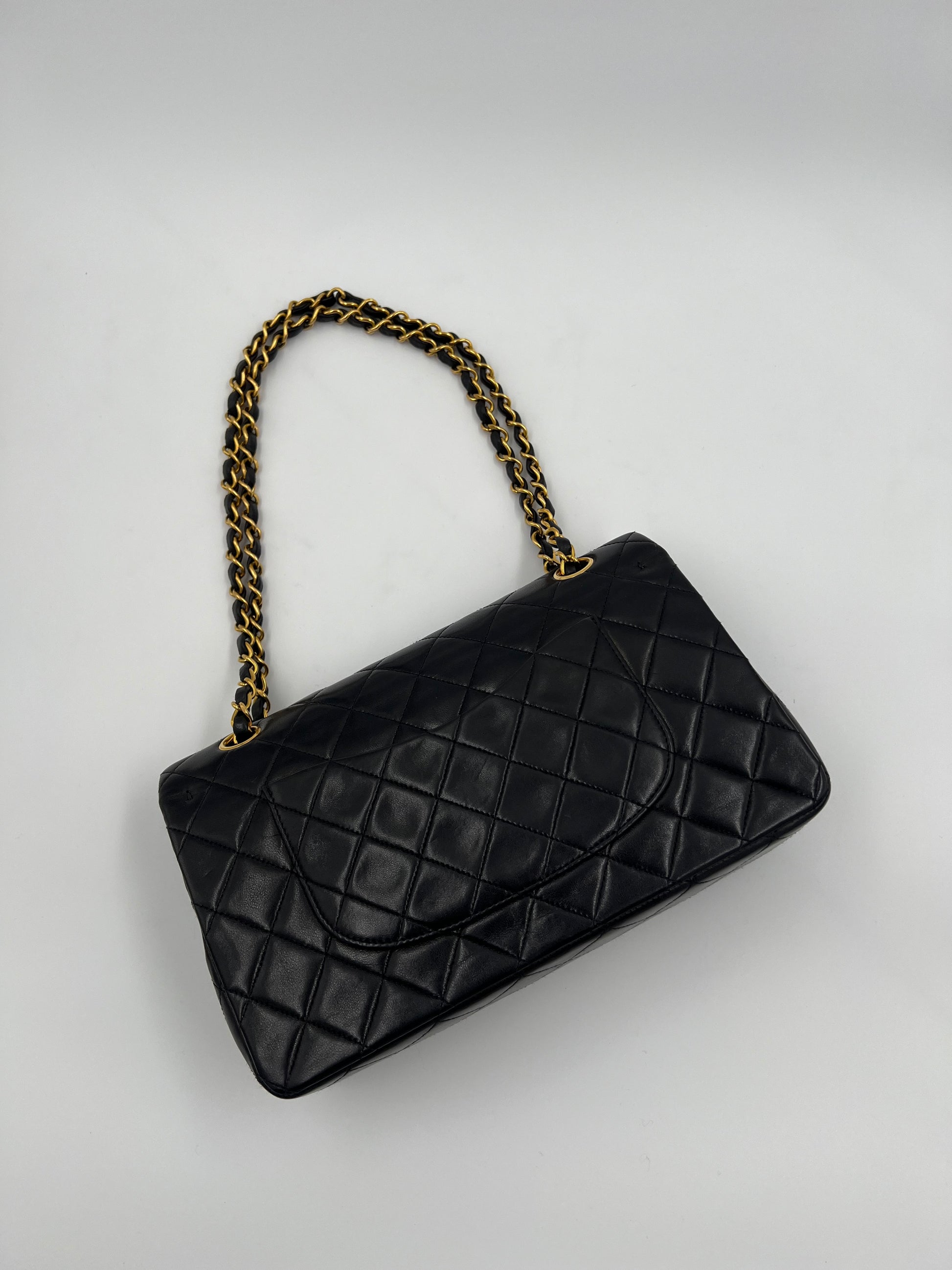 This is a vintage Chanel black medium classic double flap in quilted lambskin leather with 24k gold plated hardware. There are normal signs of wear including subtle structure loss, minor scratches on hardware and natural creasing. There is slight rubbing on the corners. The bag comes with original authentication card and Entrupy authentication (email for certificate).