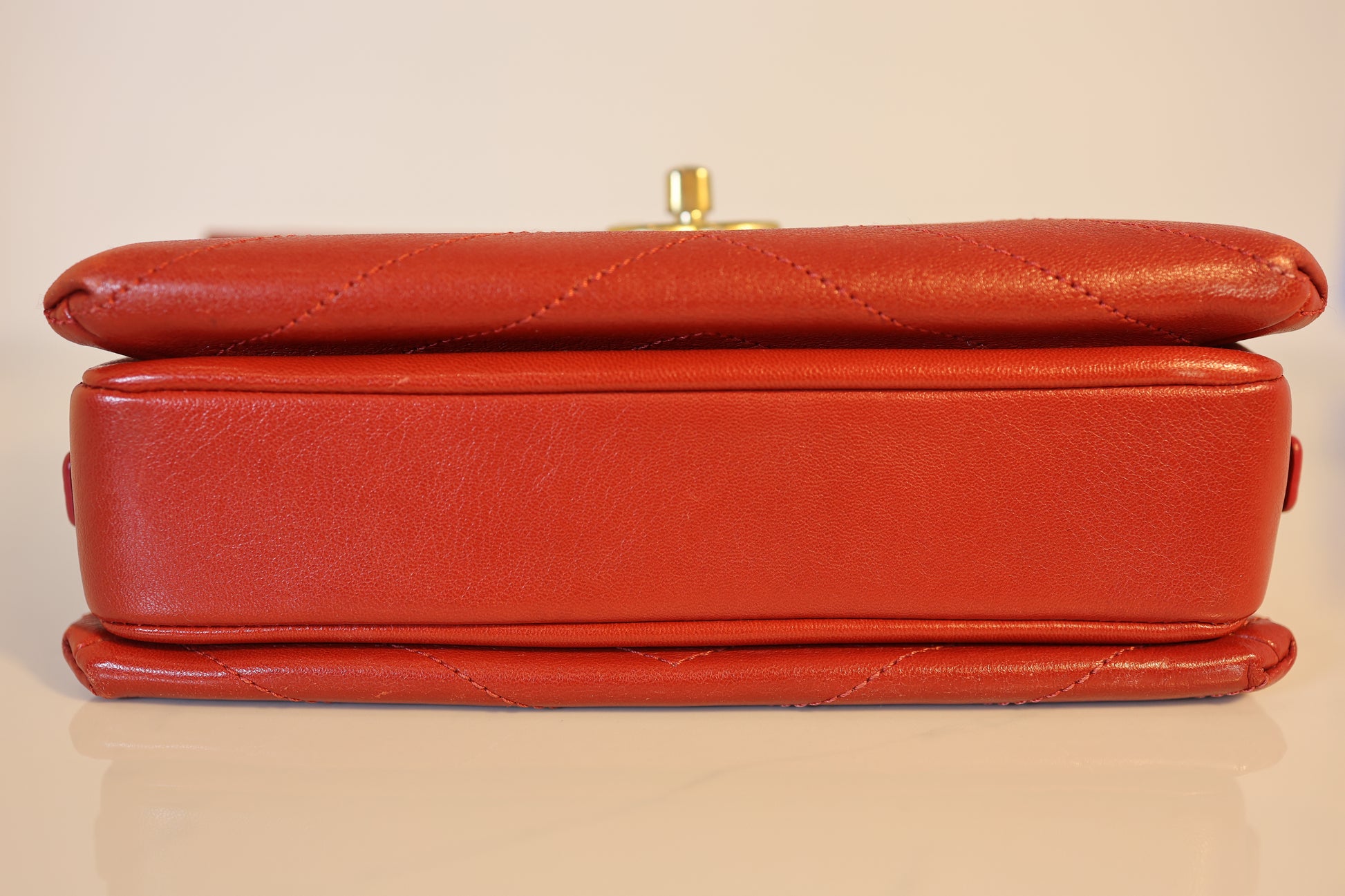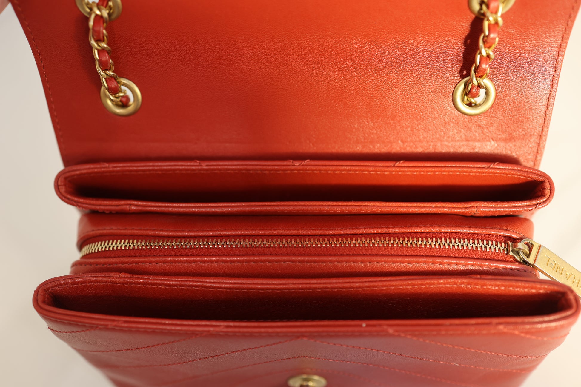 This is a Chanel envelope flap in red chevron stitched leather and lined in tonal leather. It has brushed gold-tone hardware. The wear includes minor scuffs on exterior, and slight corner rubbing, and hairline scratches to the hardware. It comes with original authenticity card.