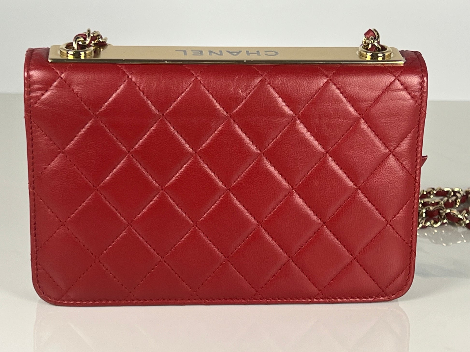 This is a Chanel red trendy wallet on chain in quilted lambskin leather with shiny gold toned hardware. It features a shiny gold Chanel top plate and classic CC turnlock closure. Wear includes minor creasing and the serial number has rubbed off. Seals are still intact on all hardware.