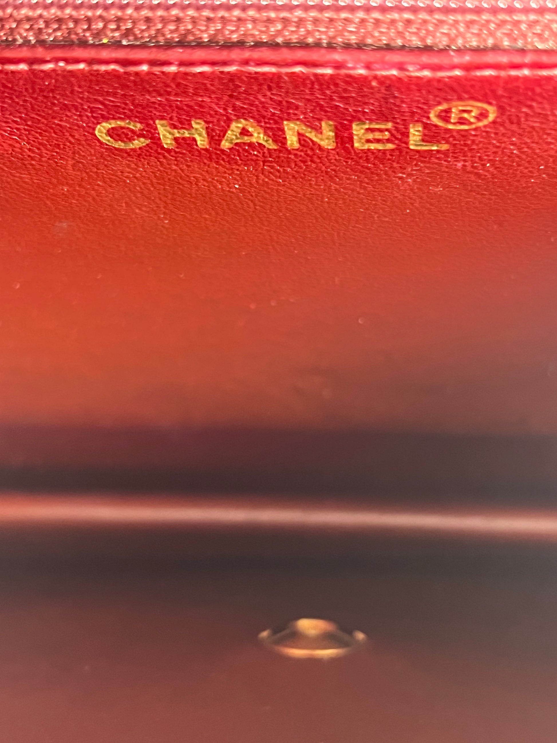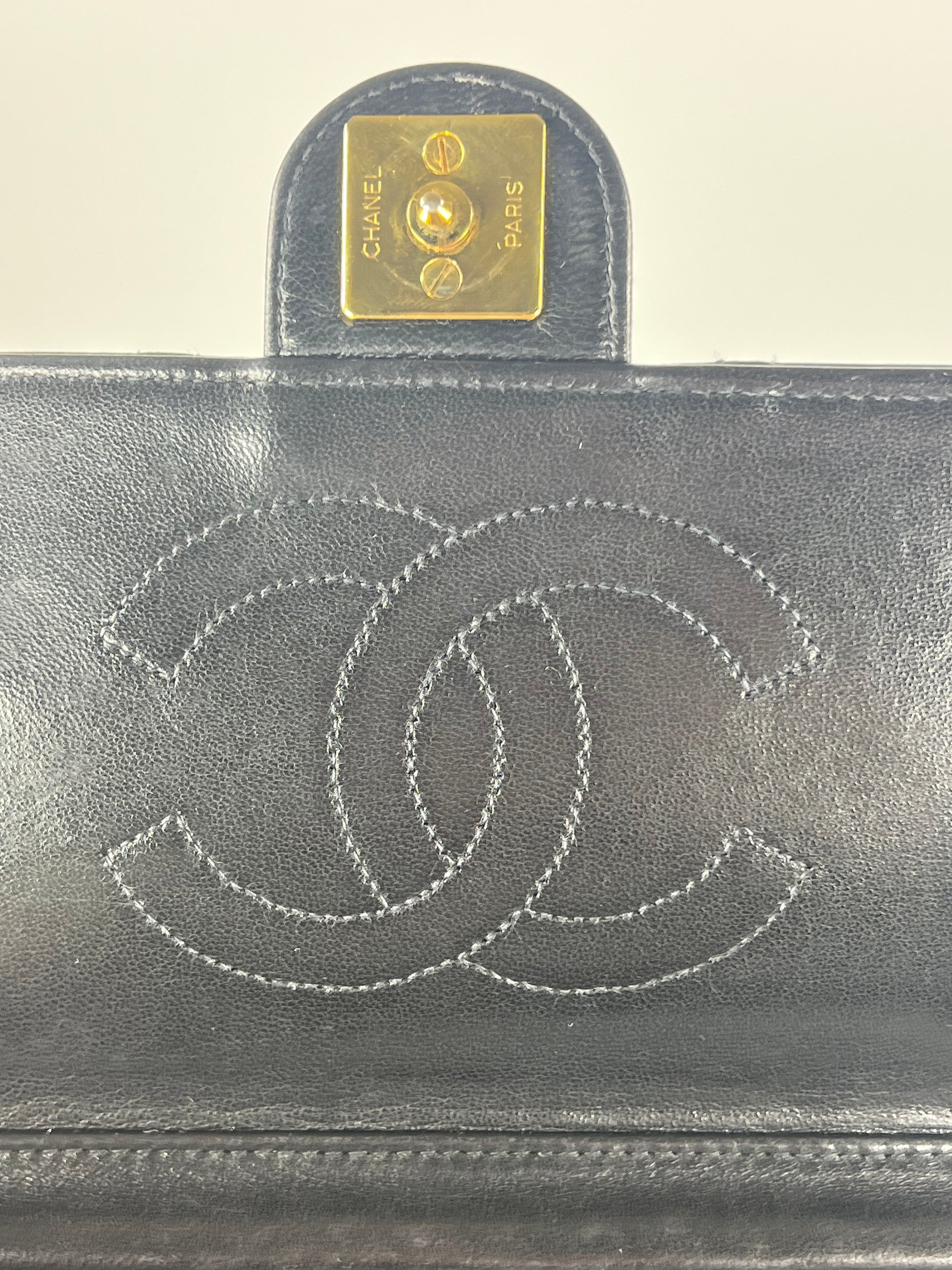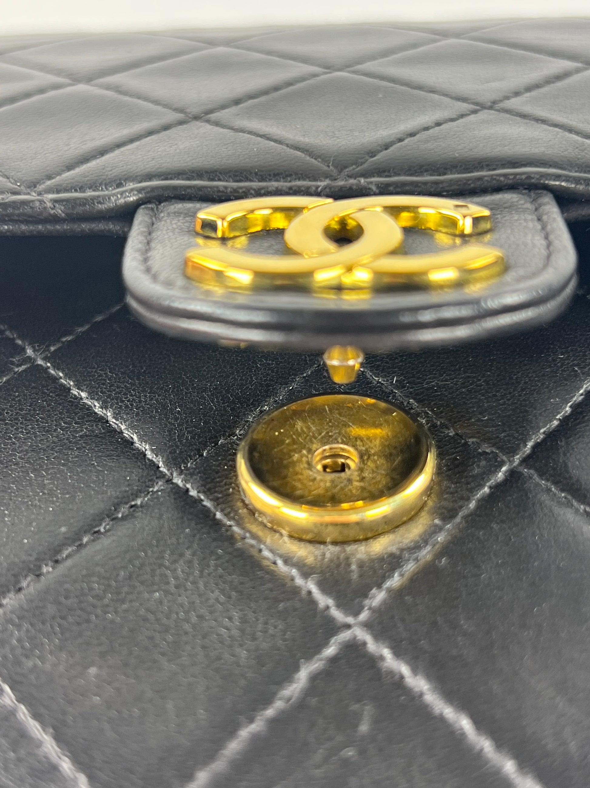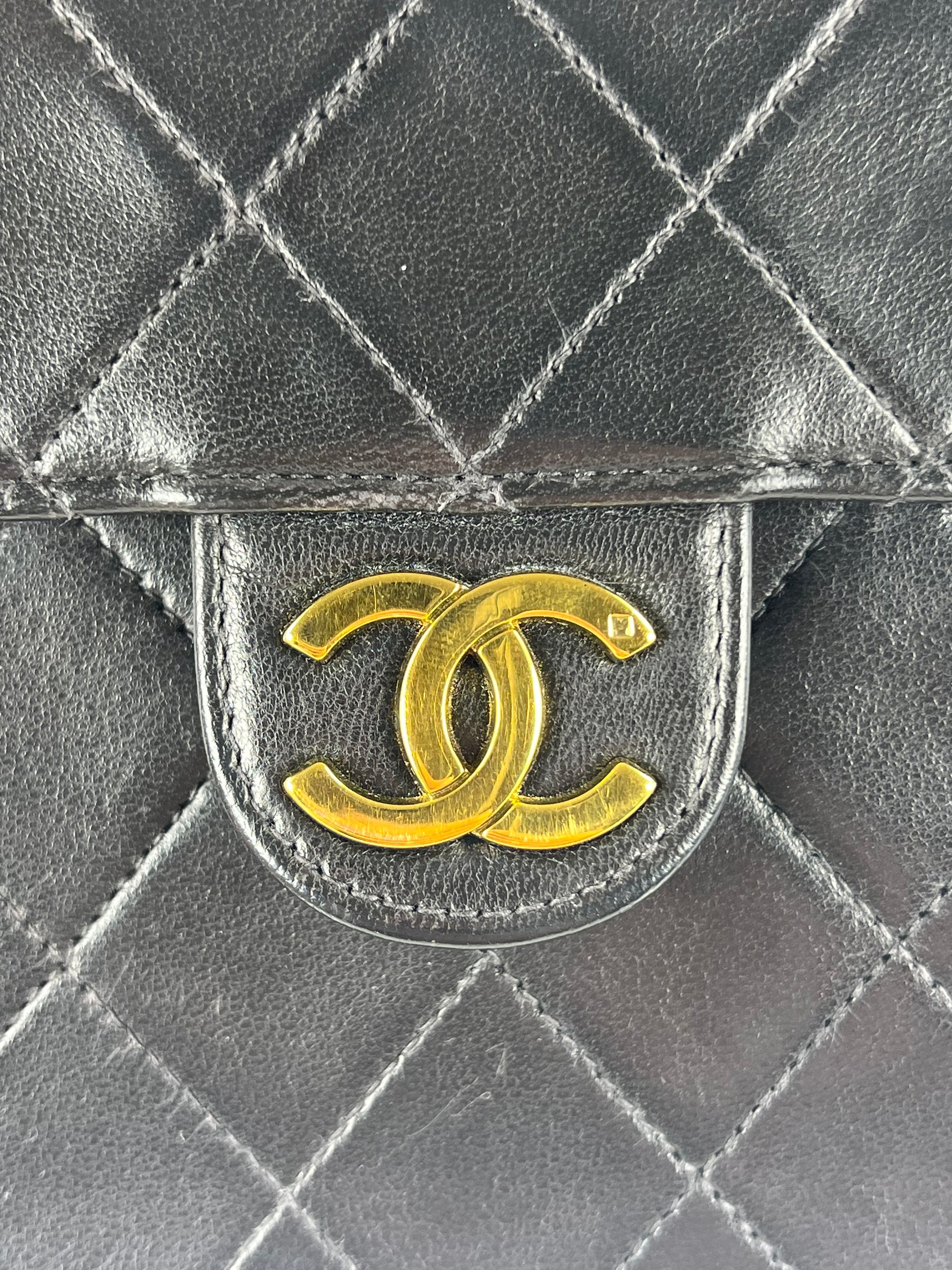 This is a Chanel Vintage Shoulder Bag in black diamond quilted lambskin leather. It is lined in burgundy-leather with 24k gold-tone hardware and features a golden CC pushlock. The wear includes slight dimpling to the quilts, light corner wear, and hairline scratches to the hardware. It comes with the original box and dust bag.