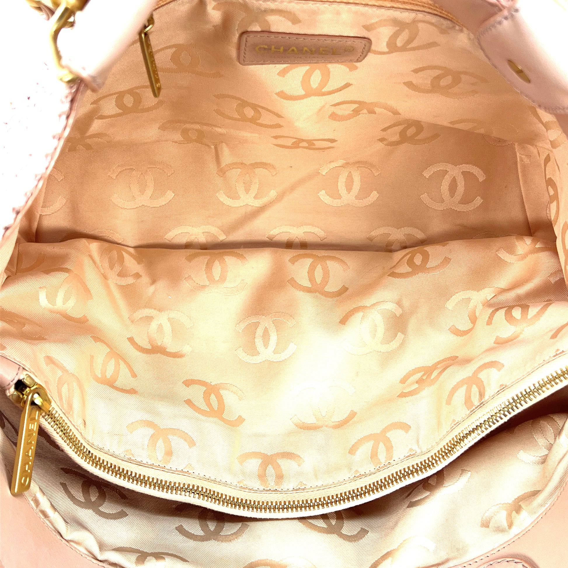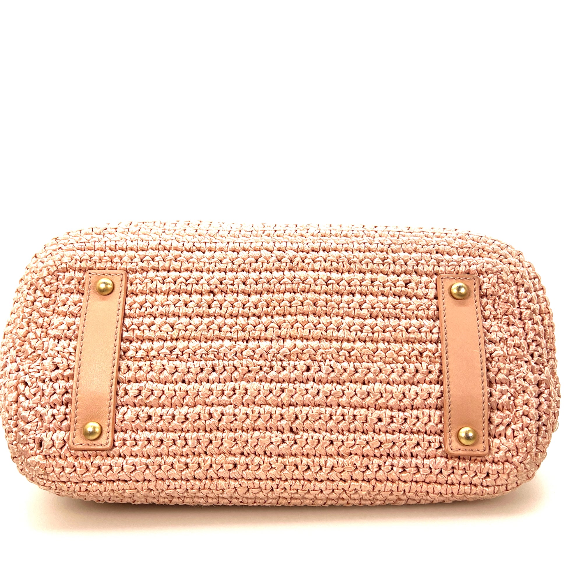 This is a rare vintage raffia tote featuring pink woven raffia with brushed 24k gold plated hardware. The bag features tonal gross grain lining with emblematic CCs throughout, a spacious interior with three compartments including one large zipped center pocket, as well as a tunlock closure. Signs of wear include darkening of the leather interwoven in the chain link strap, hairline scratches on hardware, a slight indent at the leather of the front right strap and a subtle mark on the interior lining near the inner zipper.