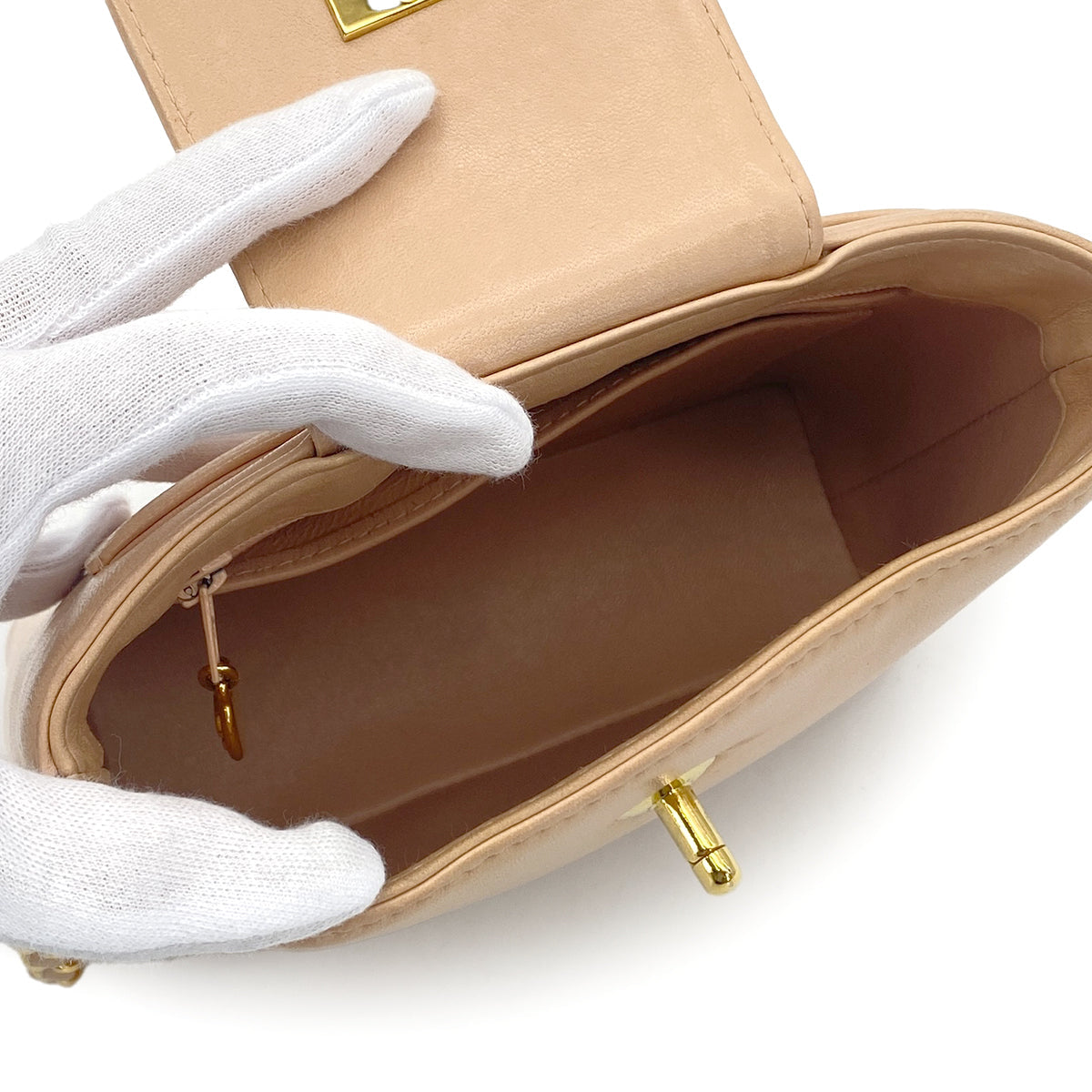 This rare find is a vintage small shoulder bag in blush lambskin leather with 24k gold plated hardware. The leather flap front tunlock closure opens to reveal a single compartment lined in tonal leather with a small zipped pocket. There is a single interwoven blush leather and gold tone chain link shoulder.