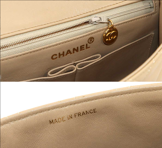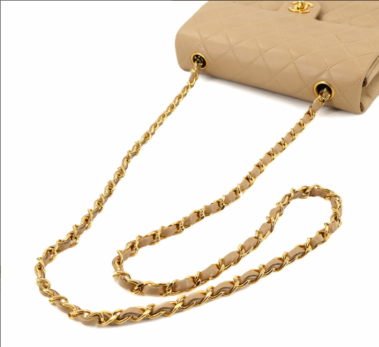 This is a Chanel Vintage Small Square Flap in beige diamond-quilted lambskin leather. It is lined in tonal beige leather with 24k gold-plated hardware and features a single flap with signature golden CC turn-lock and a leather-woven chain strap.