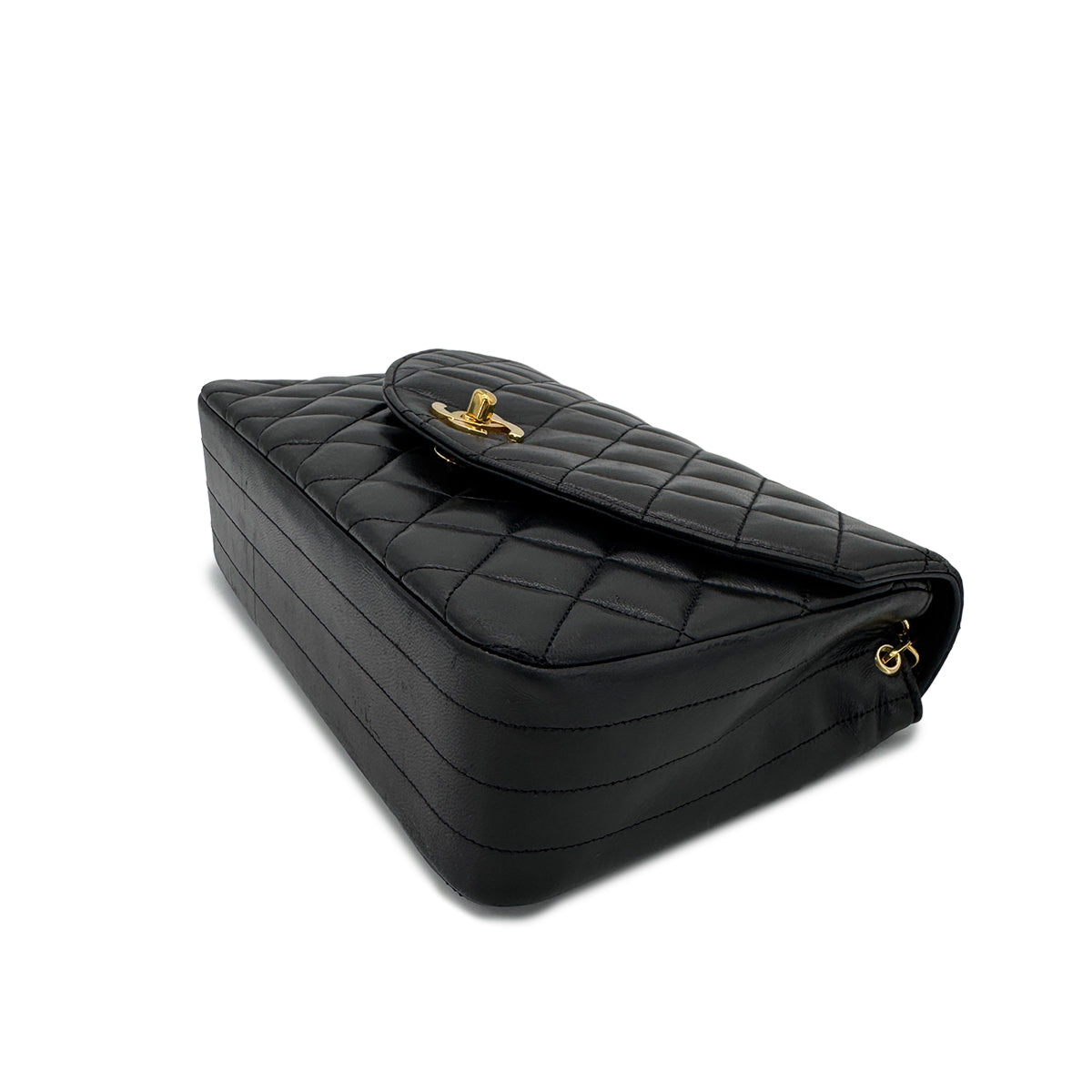 This is a vintage Chanel half moon flap in black diamond quilted lambskin leather. The turnlock closure opens to reveal a clean burgundy leather interior. All hardware is 24-karat gold plated. Wear includes slight scratches on hardware and minor softening to the structure.