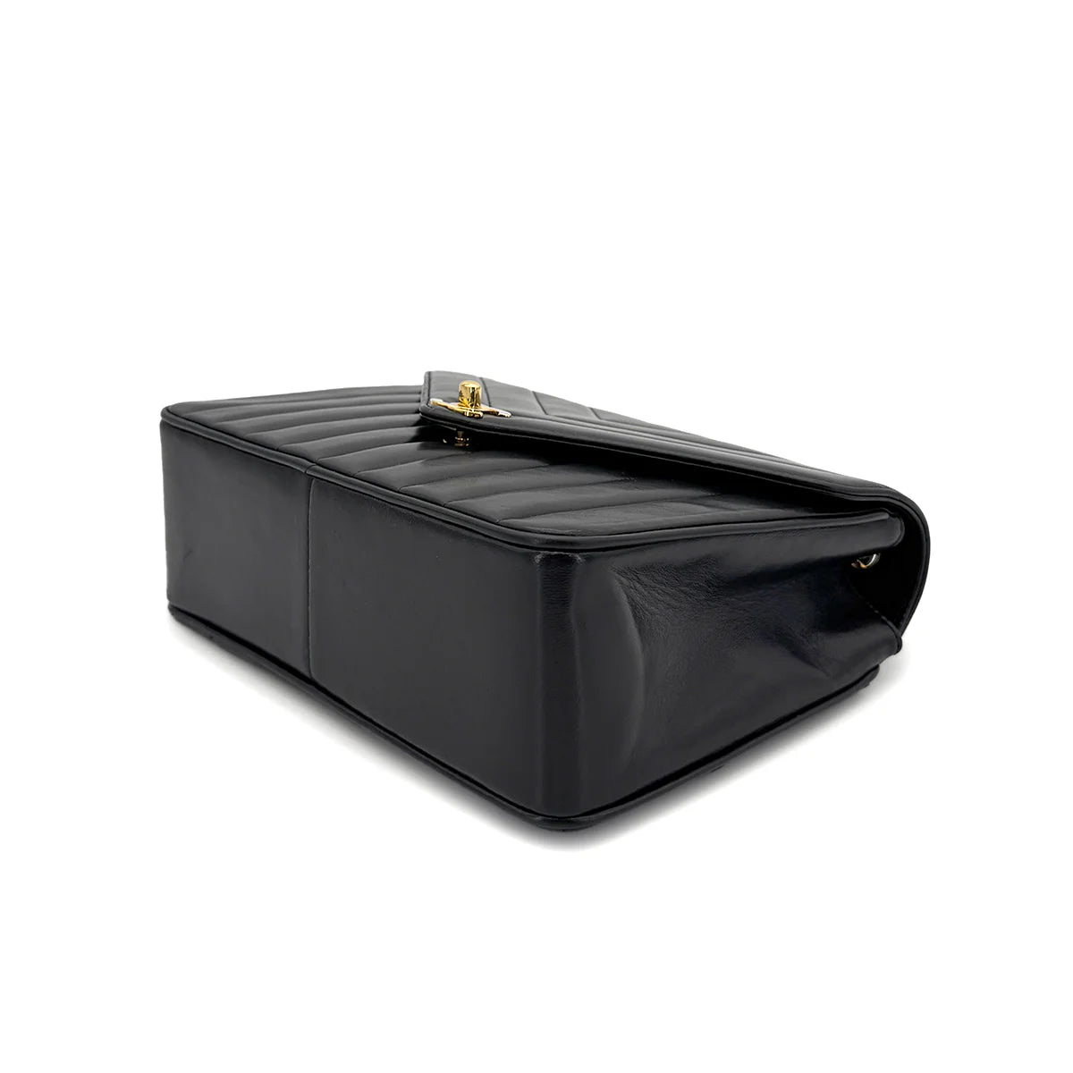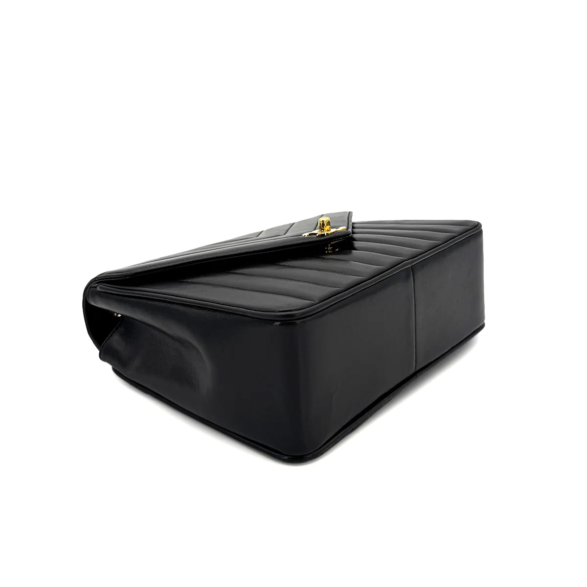 This is a Chanel Vintage Chevron Envelope Flap Bag in black lambskin leather with 24k gold-plated hardware. The bag features a structured silhouette accentuated by directional chevron and vertical quilting, creating a sculptural symmetry that is both graphic and timeless. It closes with a front flap and the signature golden CC turn-lock, and can be worn on the shoulder with a leather-interlaced chain strap that adjusts for single or double wear.