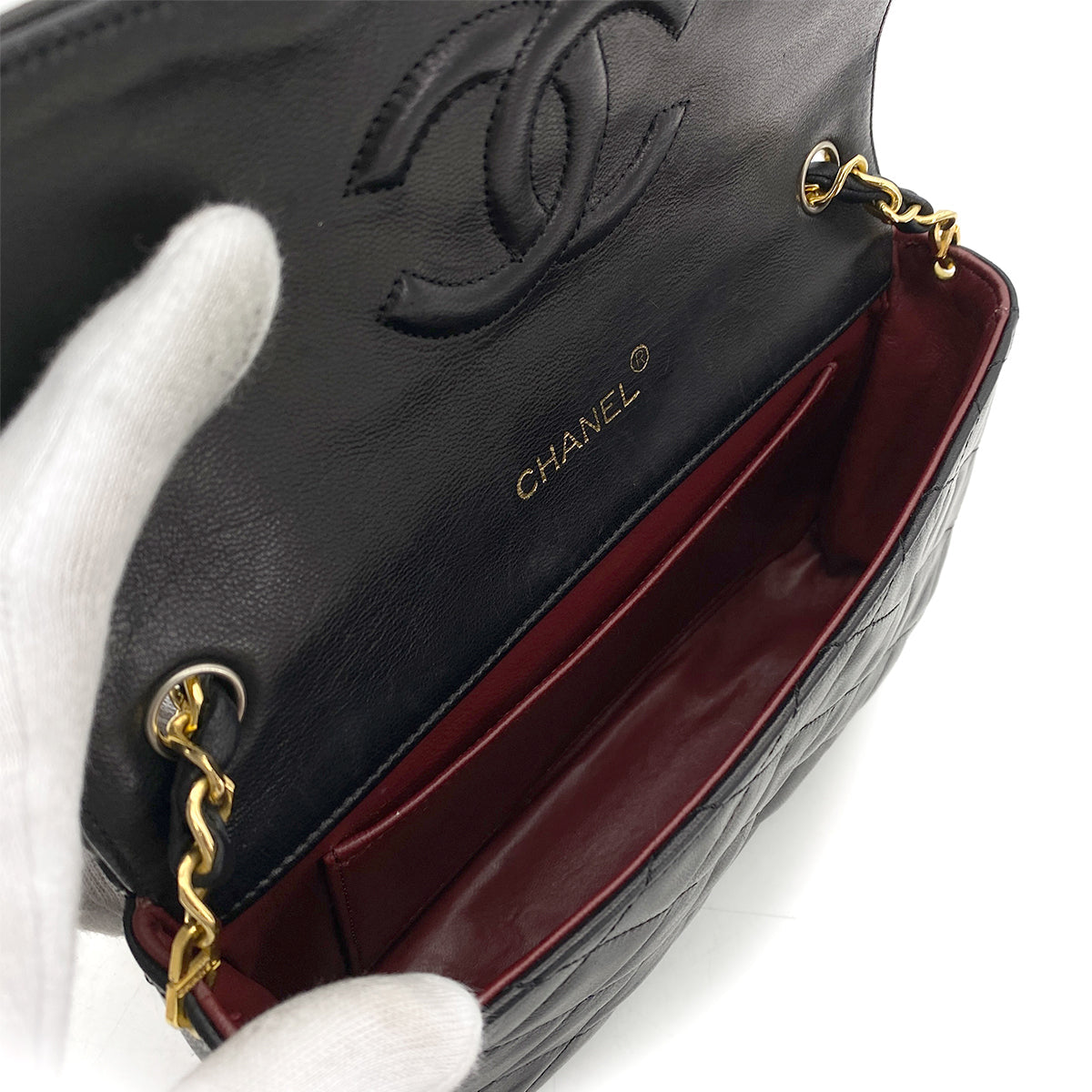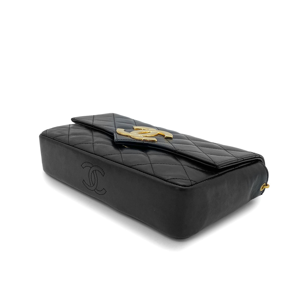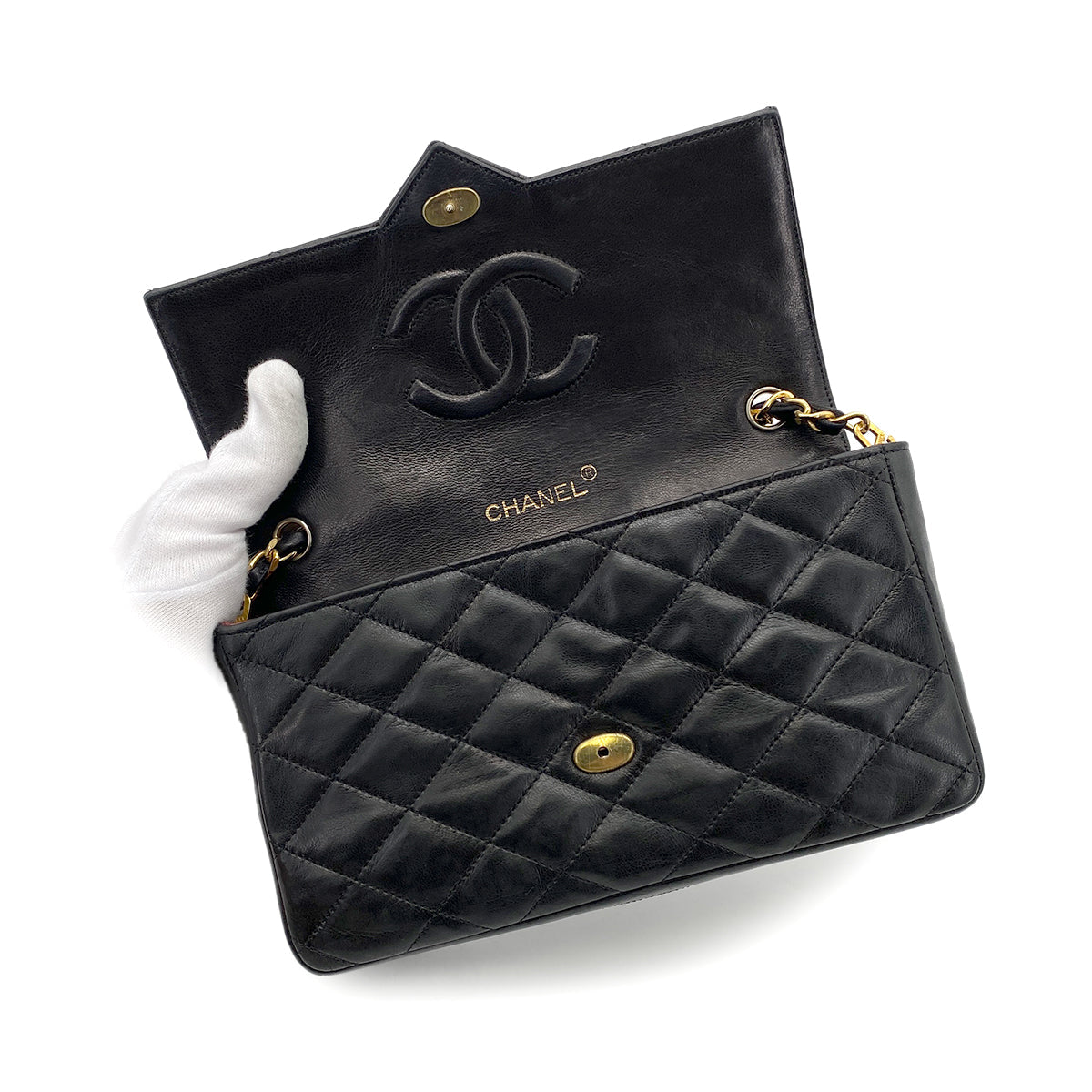 This is a vintage Chanel long envelope flap in black chevron quilted lambskin leather. It is lined in burgundy leather and features a 24k gold plated deca CC and a pushlock closure. There is also an interior pocket. The bag comes with its original authentication card.