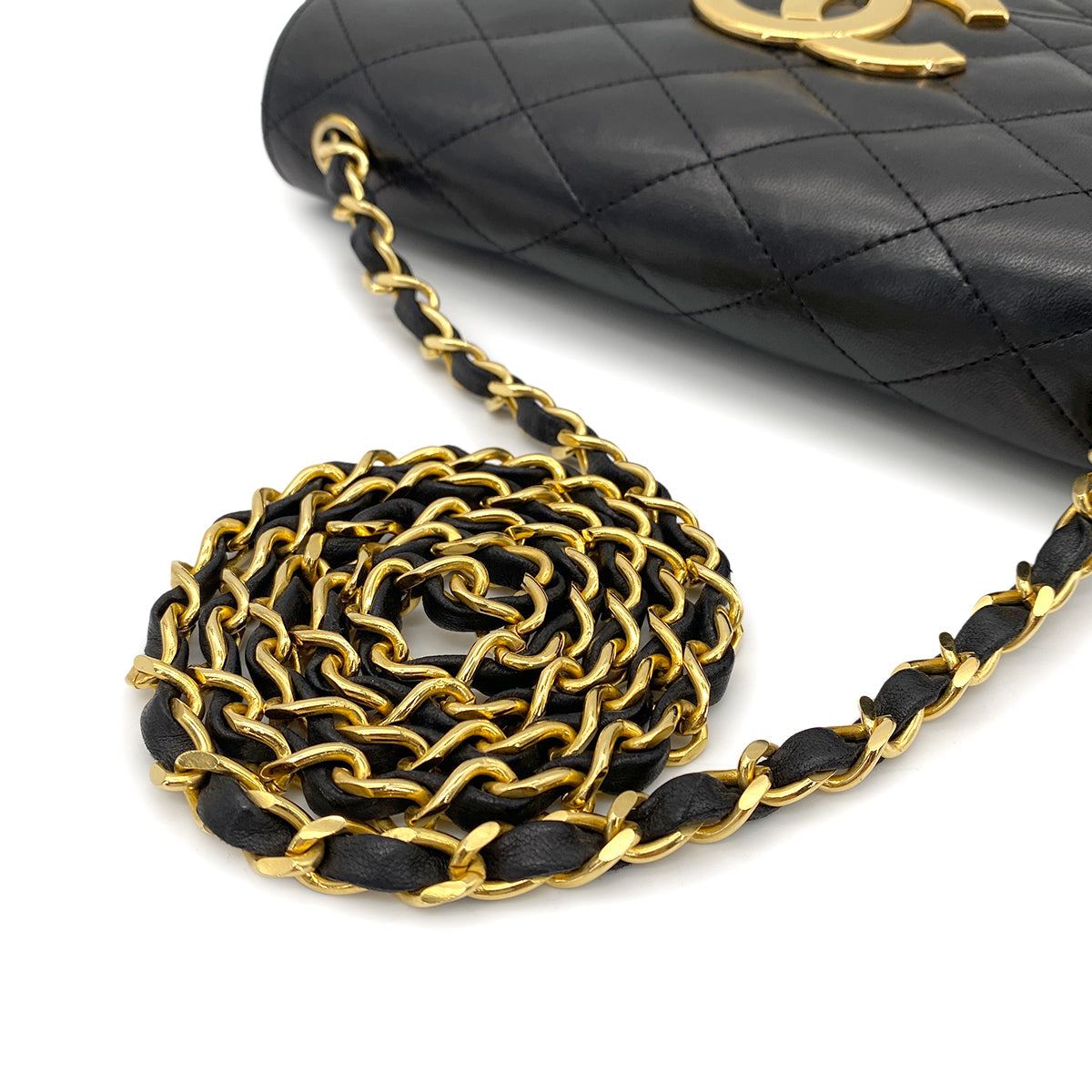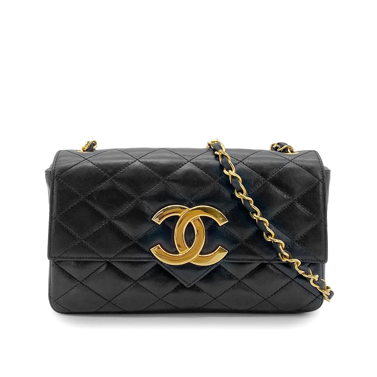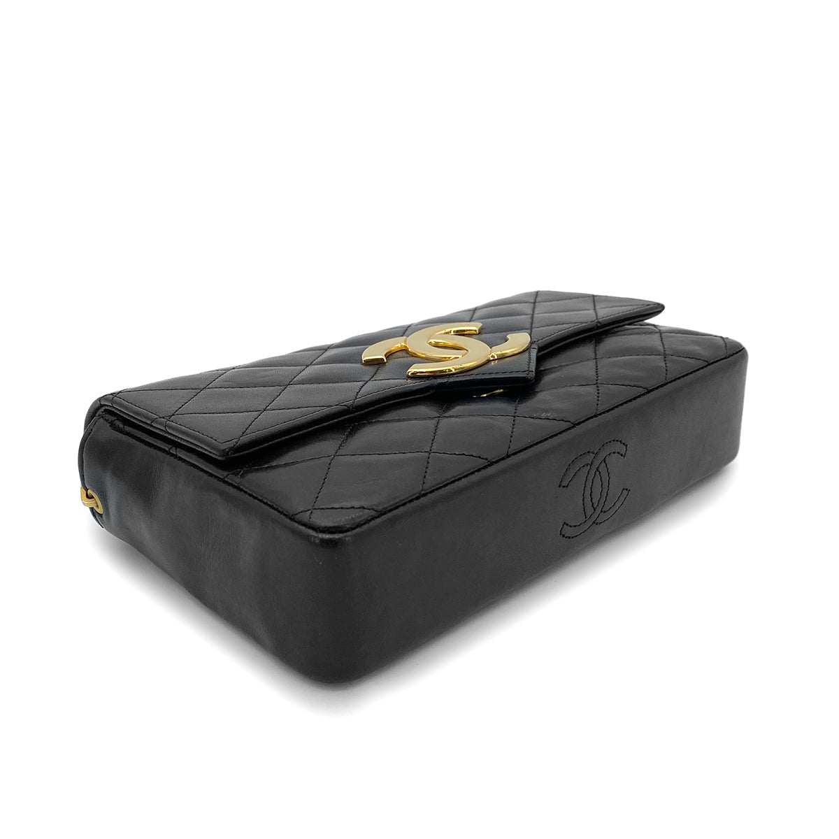 This is a vintage Chanel long envelope flap in black chevron quilted lambskin leather. It is lined in burgundy leather and features a 24k gold plated deca CC and a pushlock closure. There is also an interior pocket. The bag comes with its original authentication card.