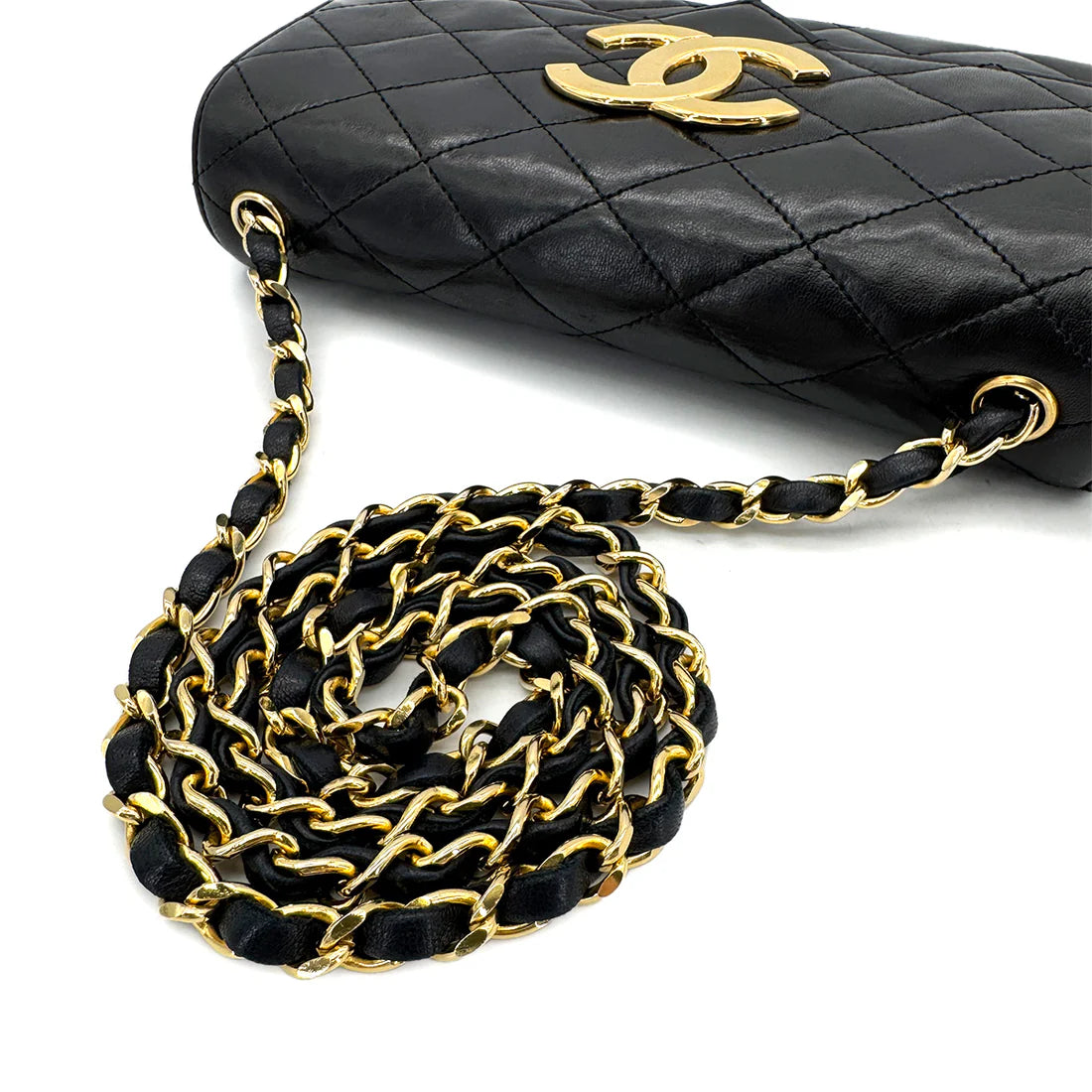 This Chanel Vintage Deca Envelope Flap is crafted in black diamond-quilted lambskin leather with 24k gold-plated hardware. Distinguished by its oversized CC turn-lock closure and elongated envelope silhouette, this design balances statement proportions with functionality. The bag is completed with a leather-woven chain strap and the signature burgundy leather interior lining.