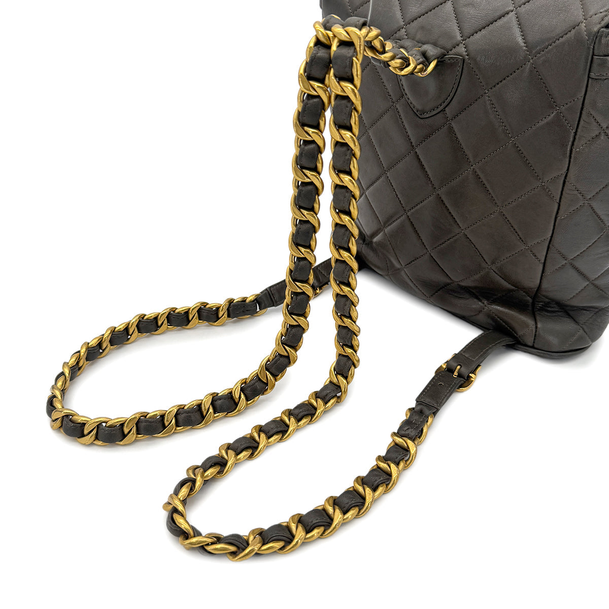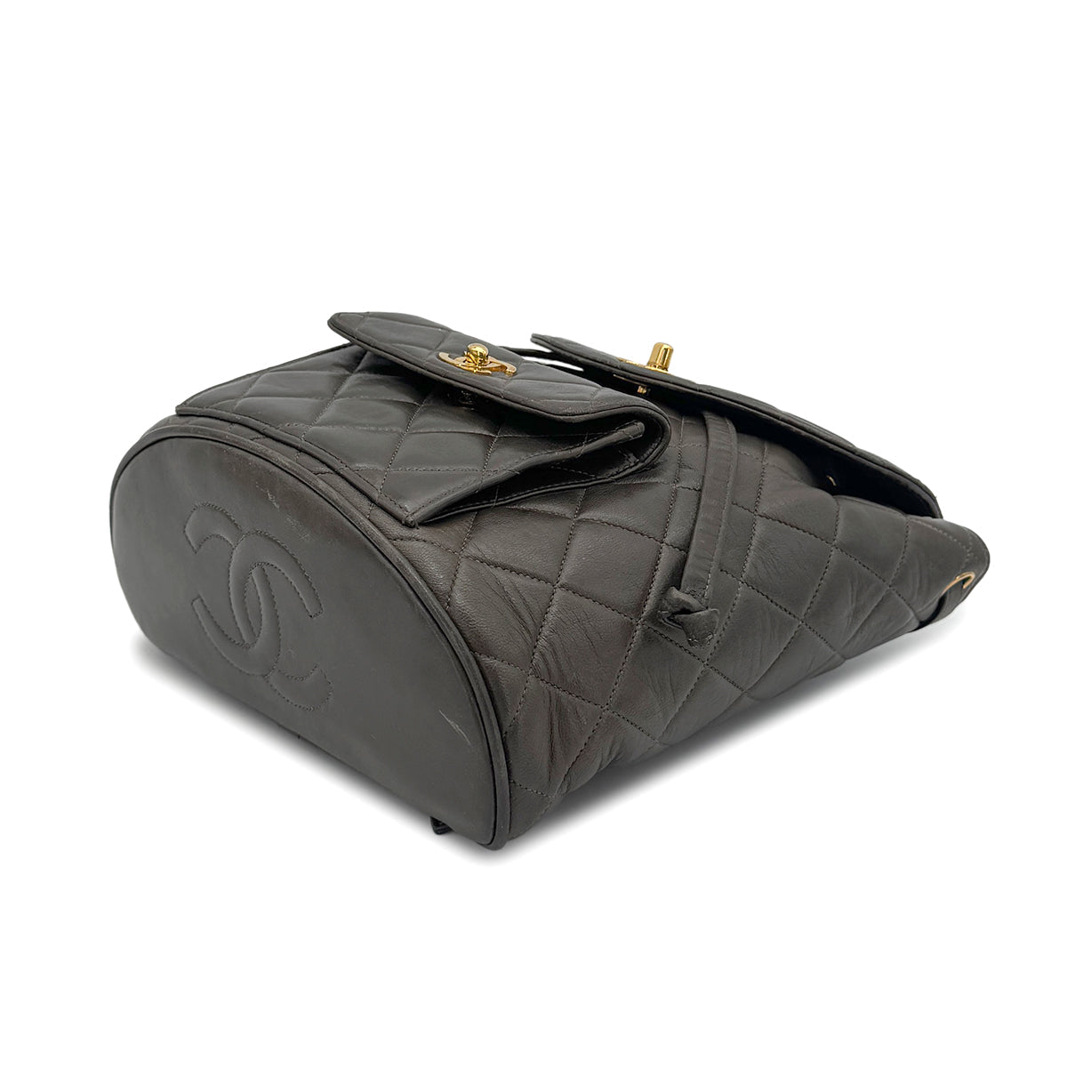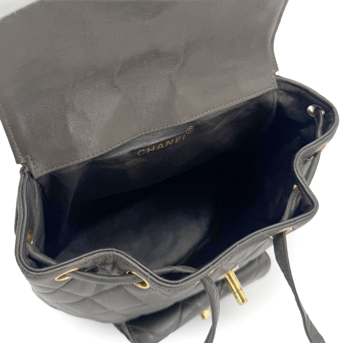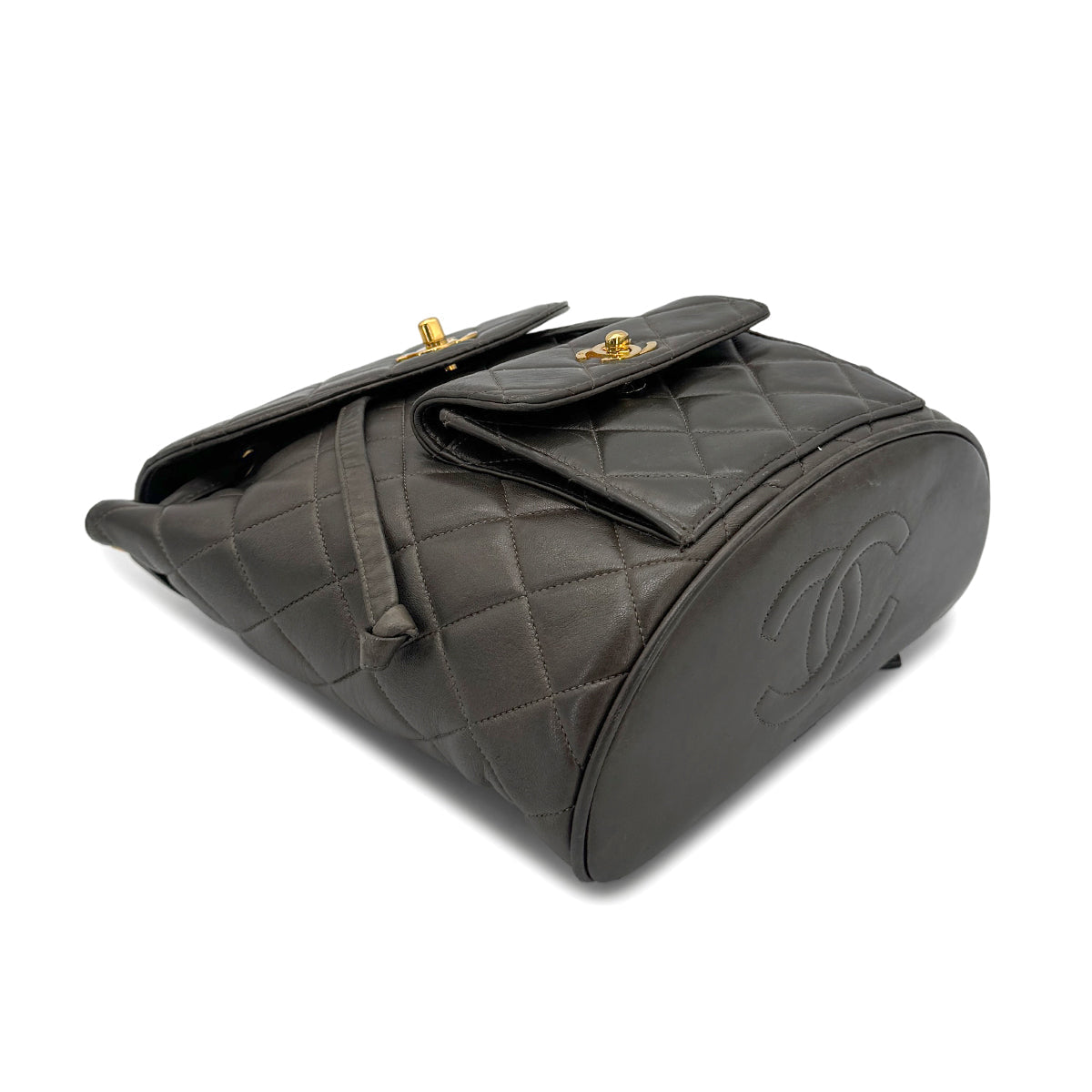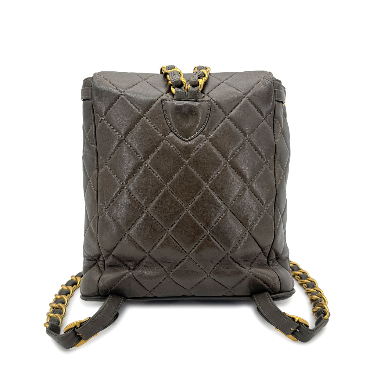 This vintage Duma Backpack is crafted in a bronzed grey quilted lambskin and features 24k aged gold plated hardware.The turnlock closure opens to reveal a single compartment lined in tonal leather. A unique second turnlock closure opens to reveal a functional front pocket lined in tonal leather.