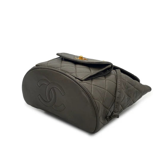This vintage Chanel Duma backpack is crafted in supple khaki lambskin with brushed 24k gold-plated hardware. Designed with classic diamond quilting, it features a rounded flap with a CC turn-lock closure, a front pocket secured by a matching CC turn-lock, and adjustable leather-woven chain straps that allow for versatile, comfortable wear. The dome-shaped base is finished with an embossed CC logo.