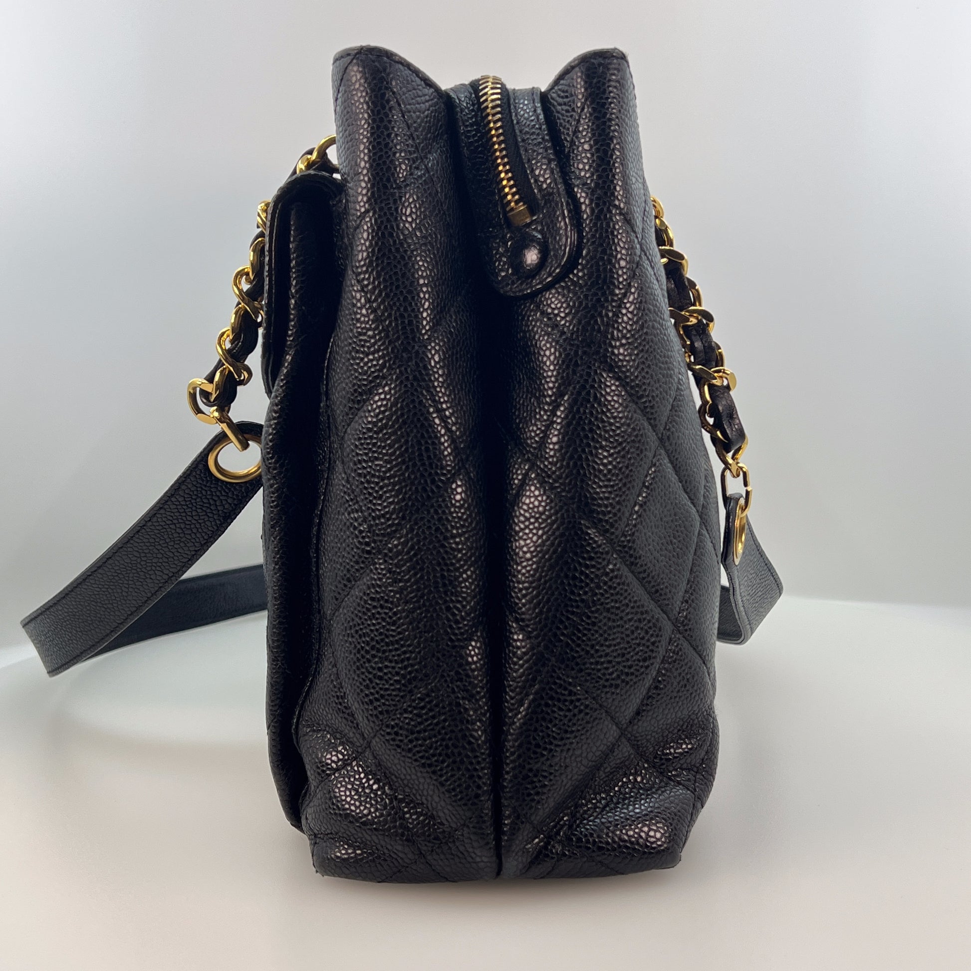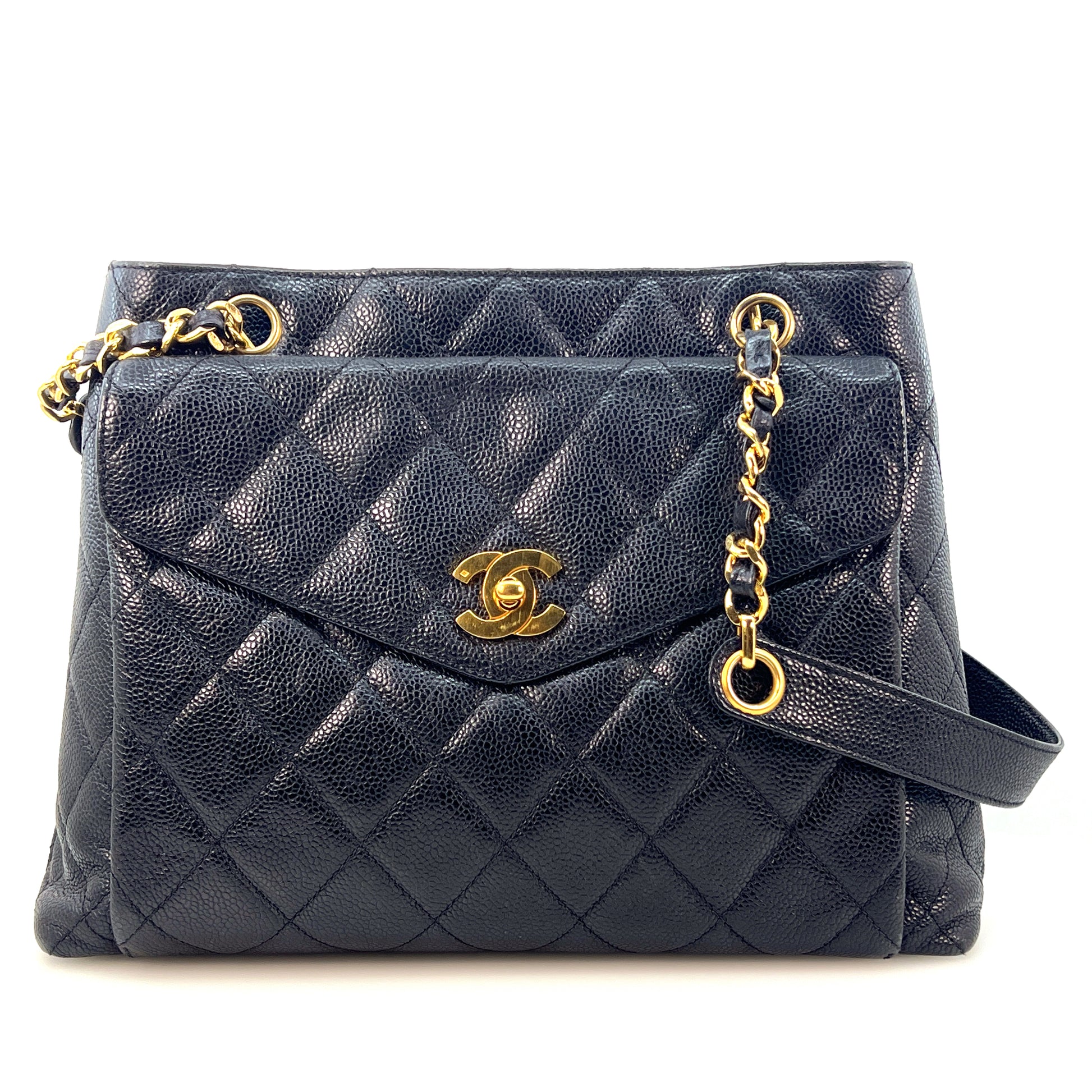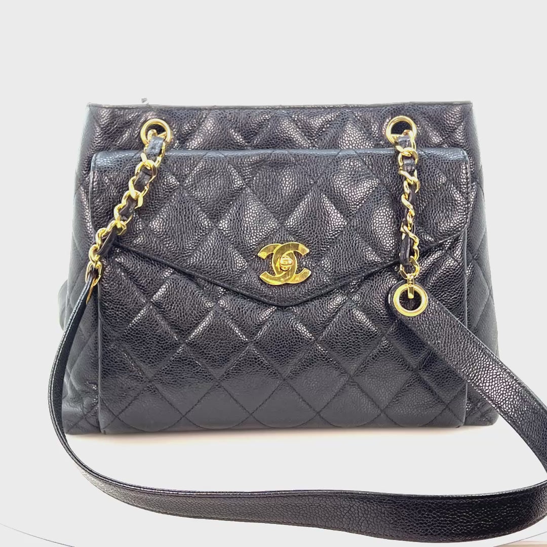 This is a vintage Chanel front pocket shoulder tote in grained calfskin leather with 24k gold plated hardware. The bag features a spacious interior with three separate compartments, including one center zipped compartment. There are normal signs of wear including subtle structure loss, minor scratches on hardware and natural creasing. There is slight rubbing on the corners. The bag comes with Entrupy authentication (email for certificate).