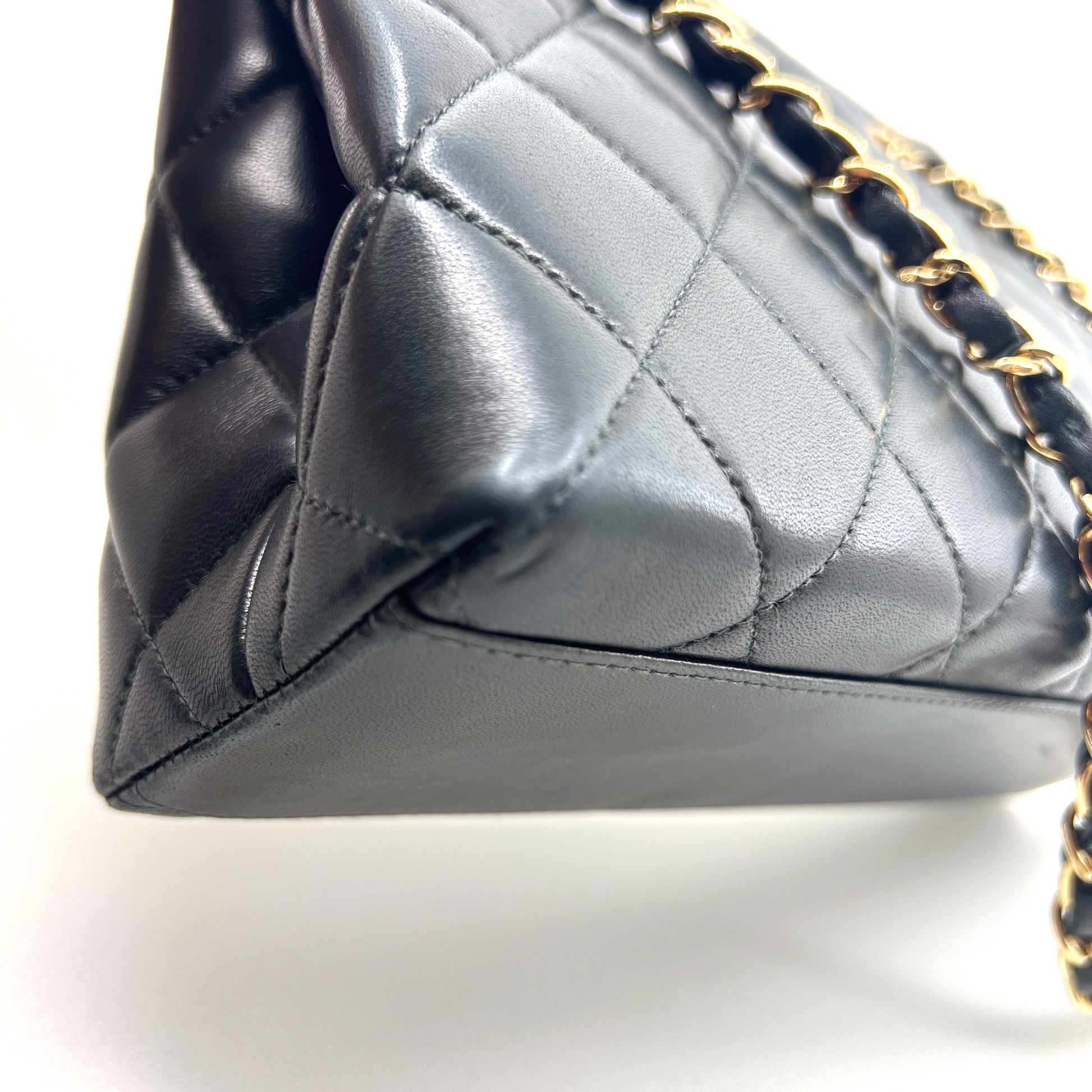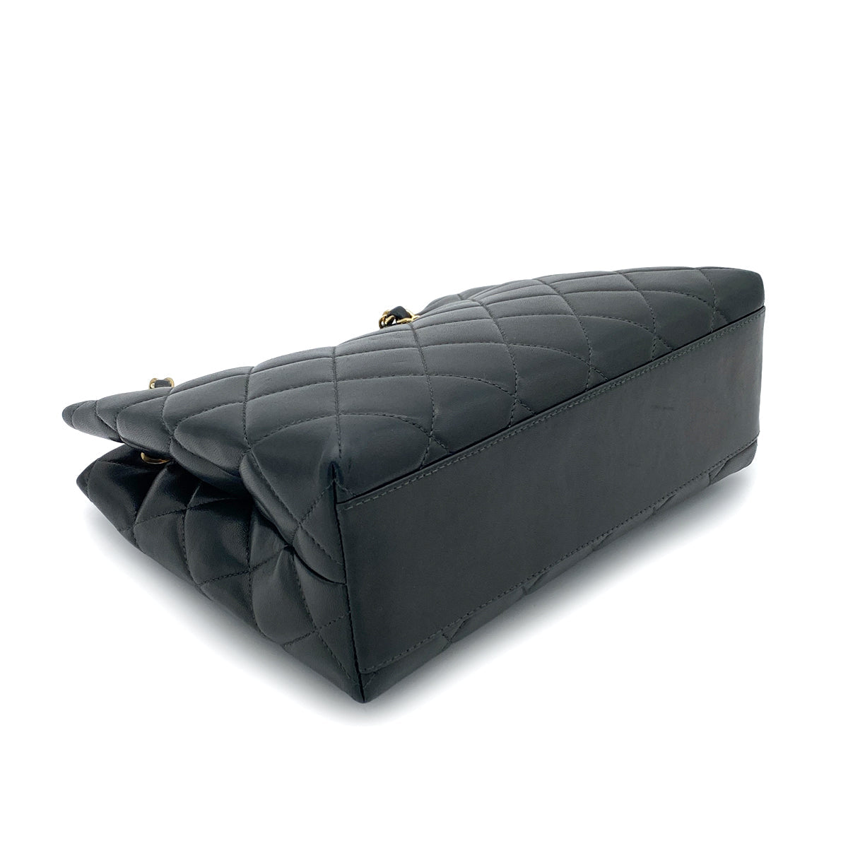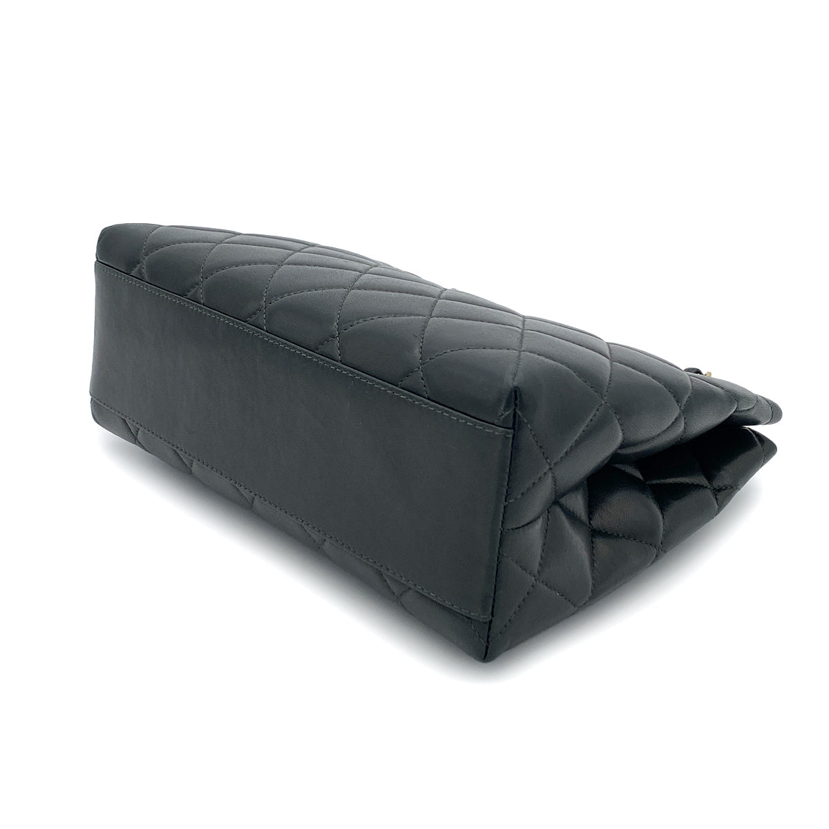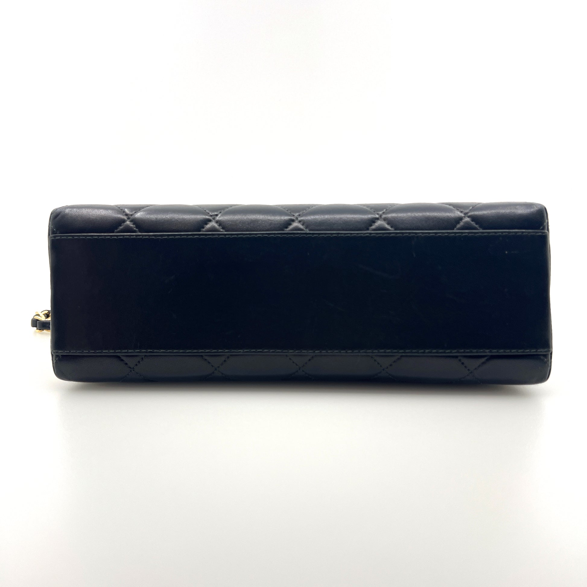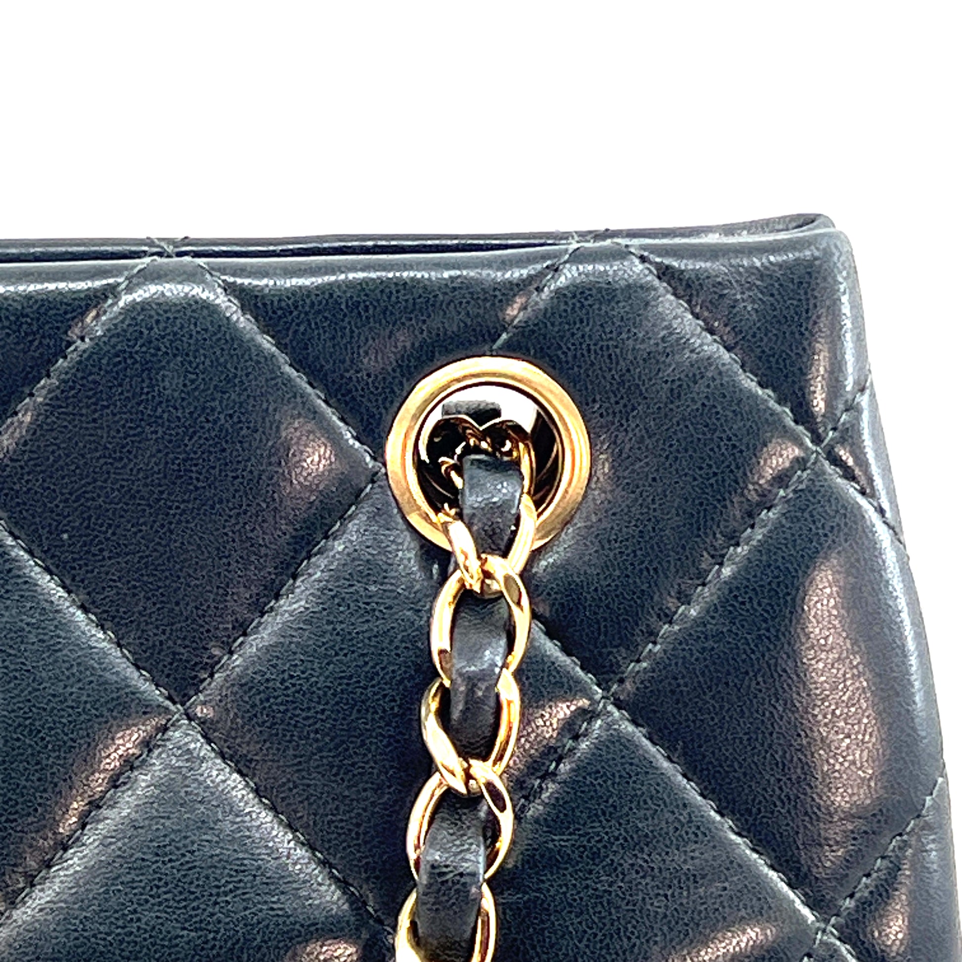 This is a vintage hunter tote in quilted lambskin leather with shiny gold hardware. The bag features tonal lining, a spacious interior and a magnetic lock closure. The strap can be worn long over the shoulder or doubled up on the crook of the arm. Signs of wear include mimor scratches on hardware and slight scuffs to the outer leather. There is slight rubbing on the corners.