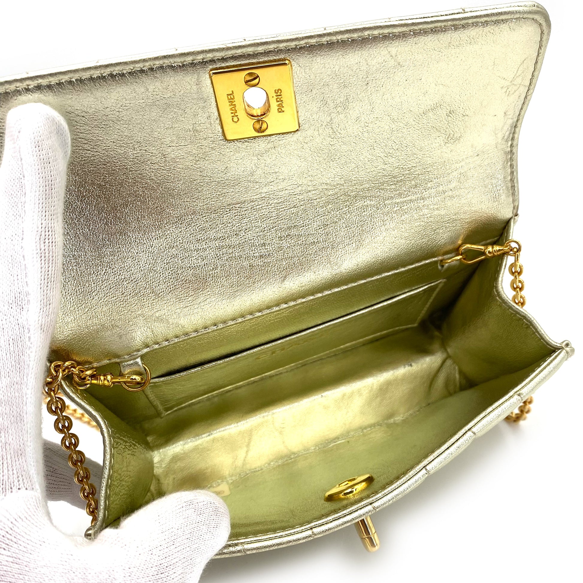 This is a vintage mini mademoiselle bag in padded gold lambskin leather with 24k gold plated hardware. The bag features a vertical ribbed quilting detail, and a functional back pocket. The front flap turnlock closure opens to reveal a single compartment lined in tonal leather with a small interior pocket.There is a delicate gold chain that can be worn over the shoulder or tucked in to make the bag a clutch.