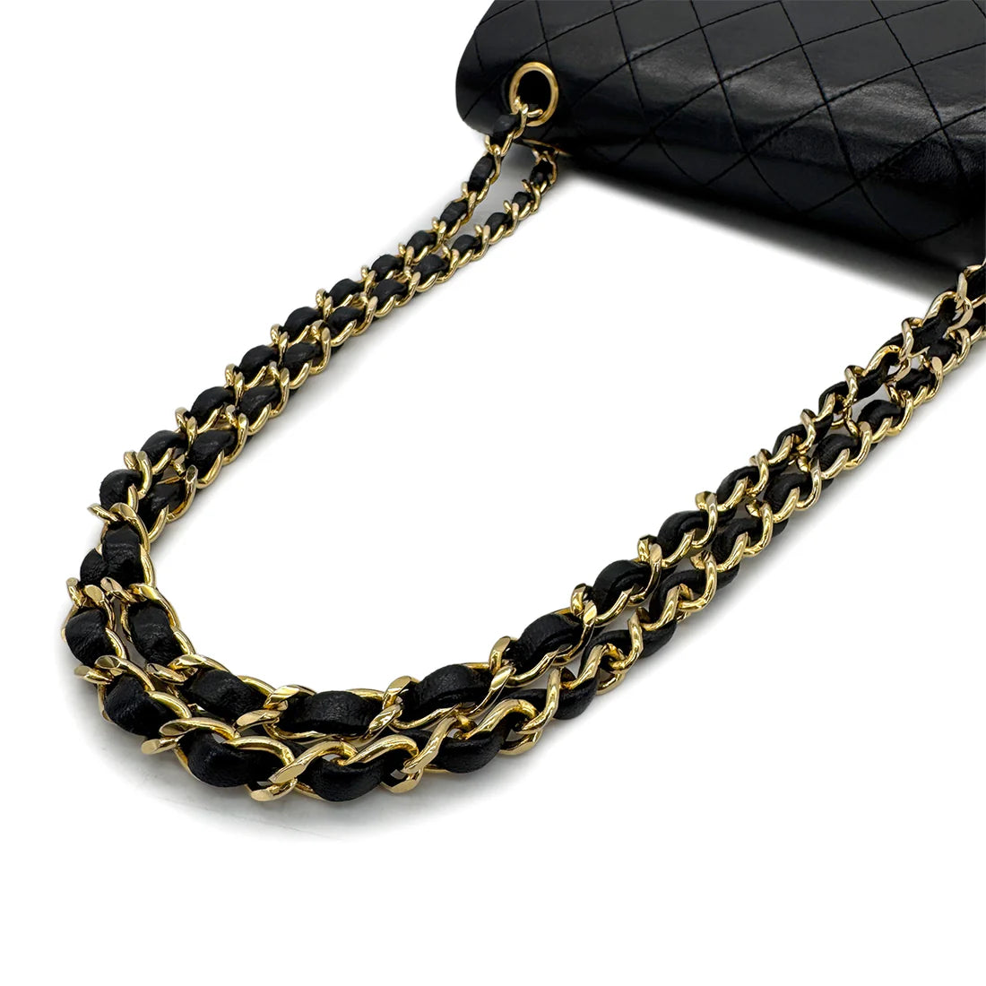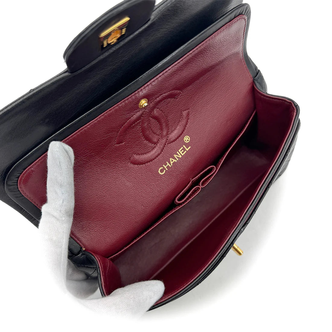 This is a Chanel Vintage Small Classic Double Flap in black diamond-quilted lambskin leather with 24k gold-plated hardware. It features the iconic CC turn-lock closure, leather-woven chain strap, and signature burgundy leather interior.
